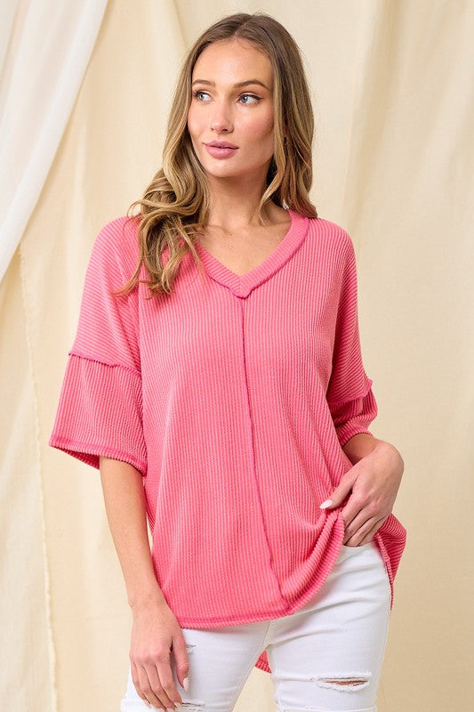 This solid short sleeves top is made of a rib material. Features a v neckline and a contrast 5 color thread details.