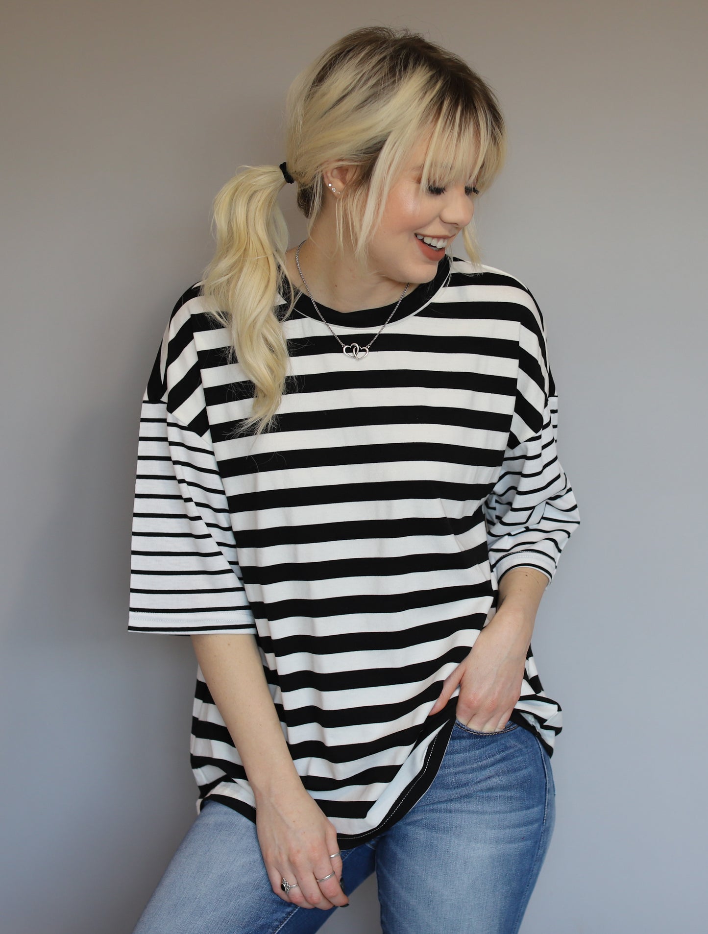 - Stripe jersey T-shirt - Stripe print cotton Jersey fabric - Round neck - Contrast thin stripe sleeves - Drop shoulder - 1/2 sleeves