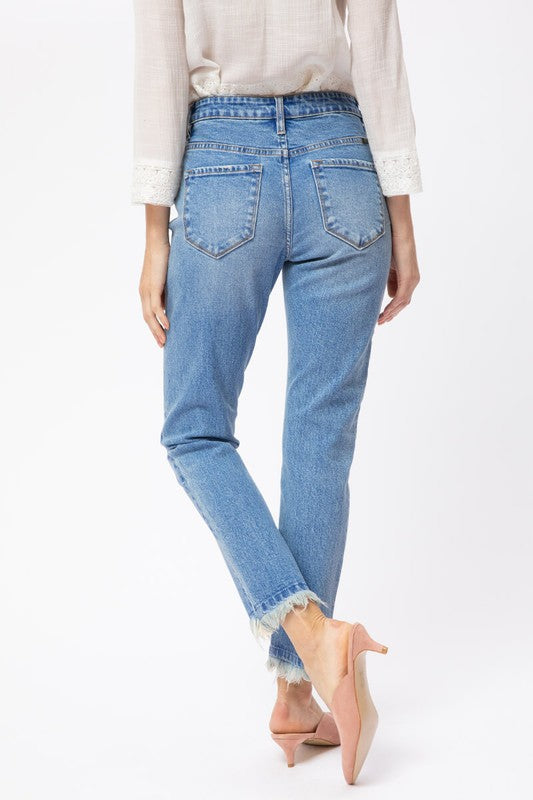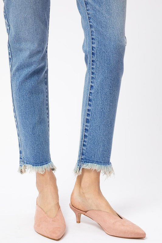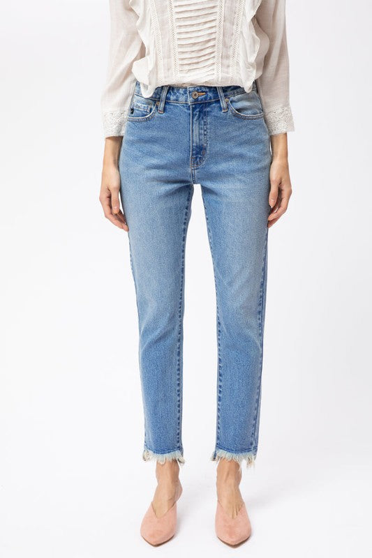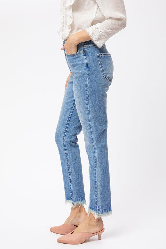 These high rise straight leg jeans are the perfect light wash color to go with any top and are super comfy. They have no distressing on the legs and a raw hem. True to size.
