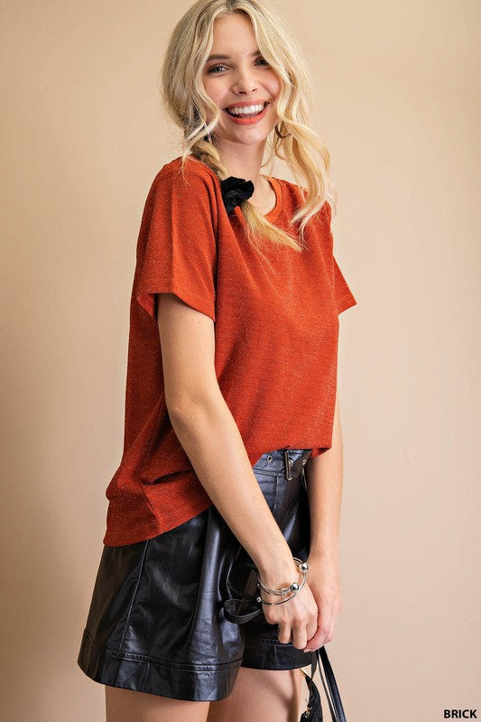 Gorgeous brick colored top with a foiled glitter detail. Perfect color for fall!