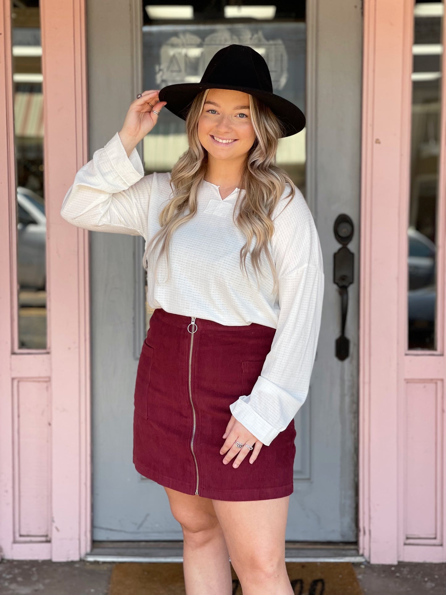 Patch Pocket Solid Corduroy with front Zip closure A-line Mini Skirt.
