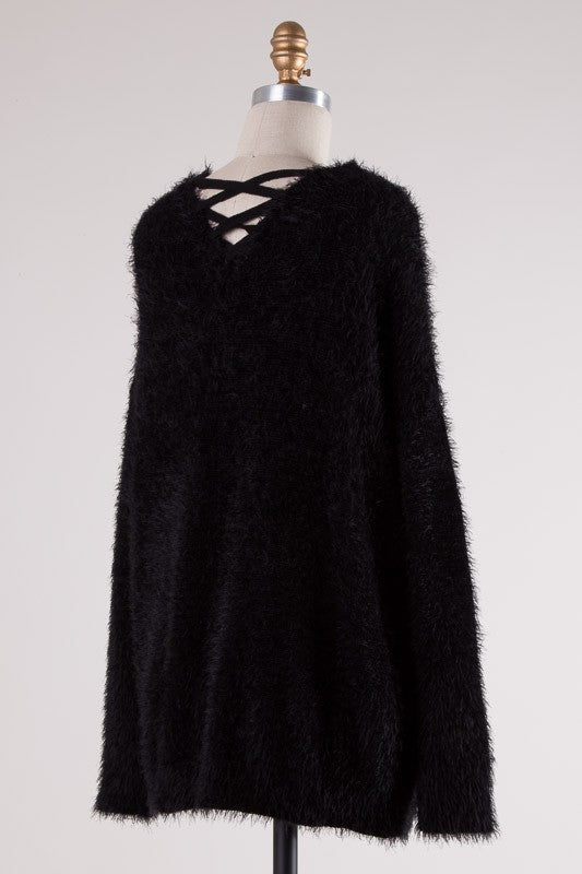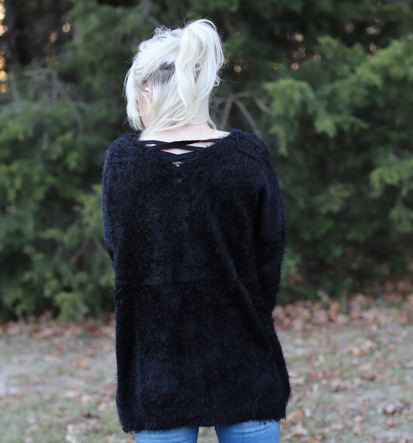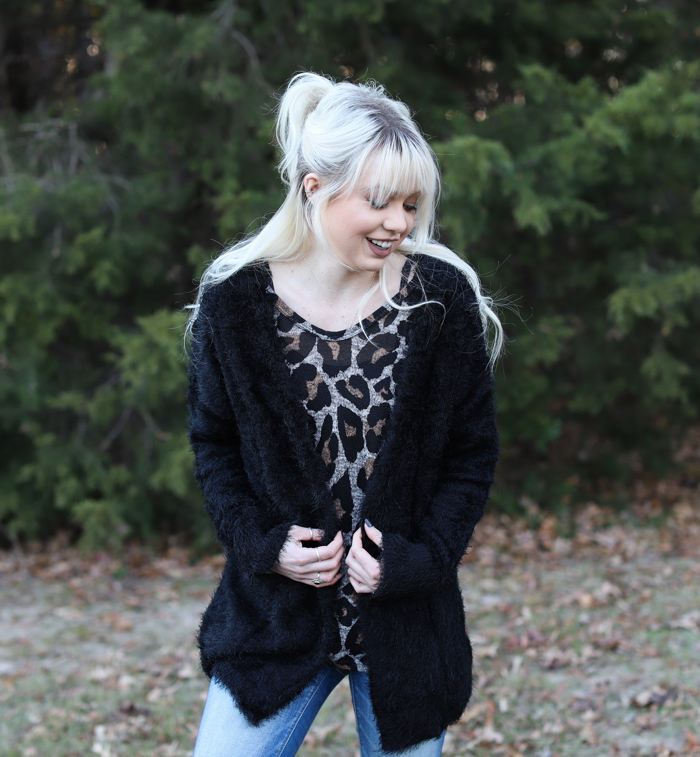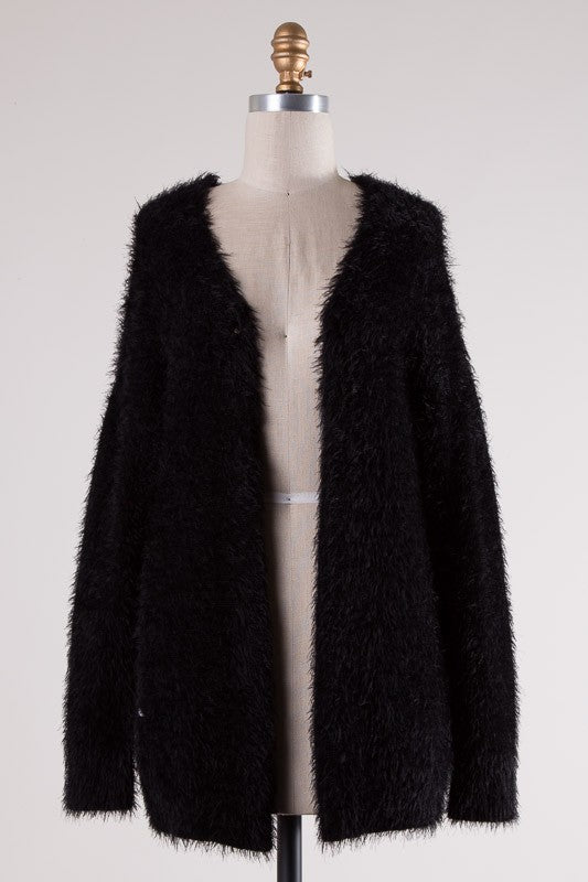 Dropped shoulder hem, long sleeve, back lattice, fuzz knit black cardigan.