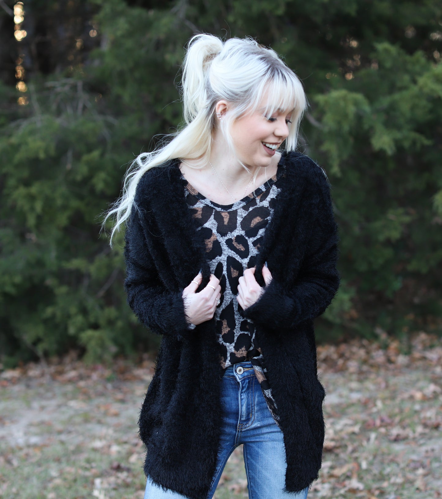 This cardigan is so soft & cozy! You can easily dress up this cadigan or wear it casual. It's fuzzy & has strappy detailing on the back.