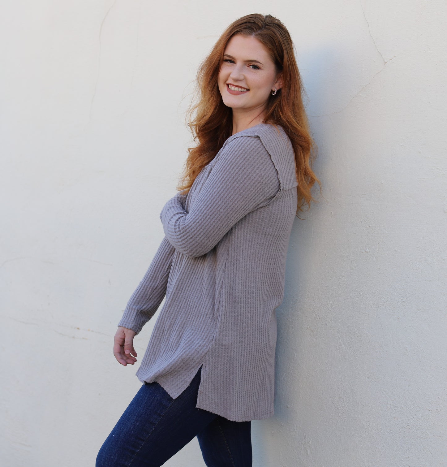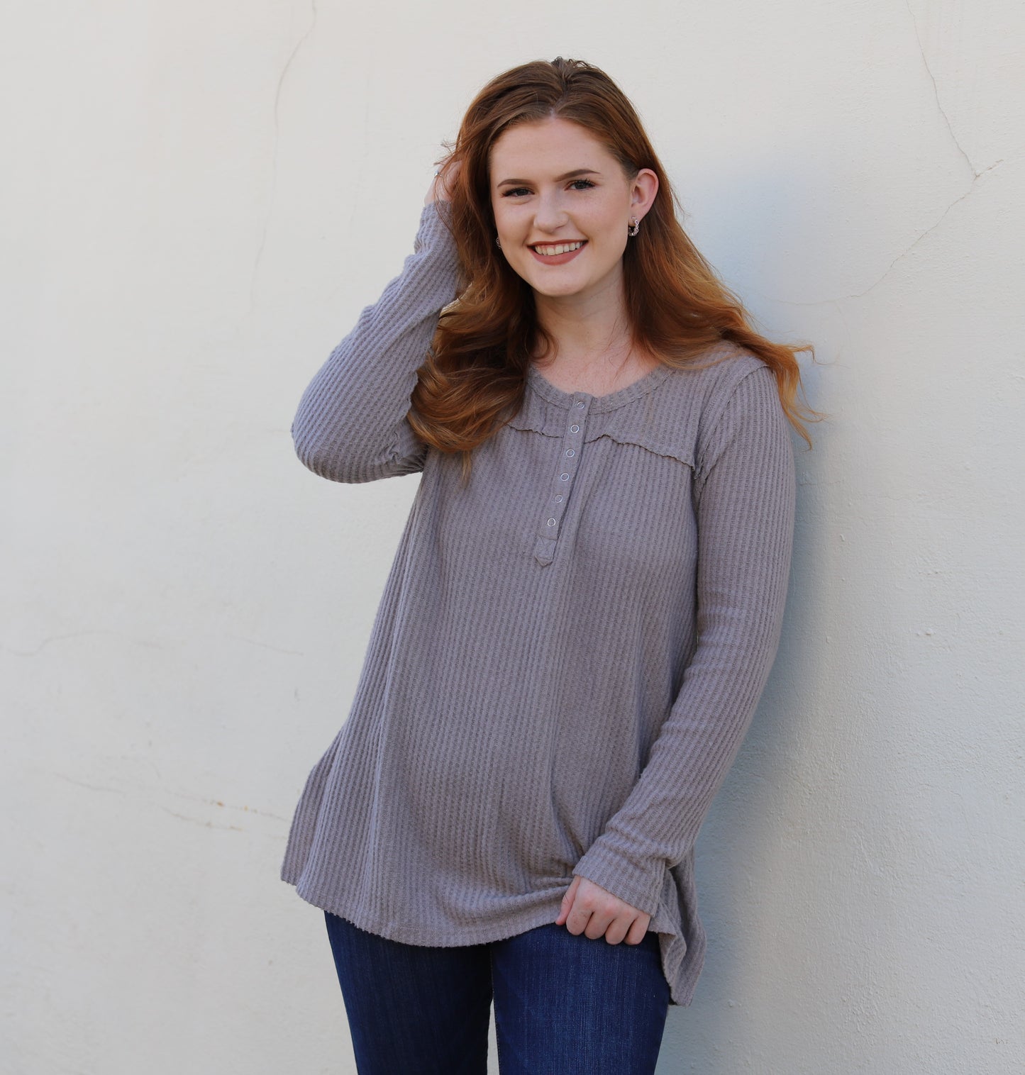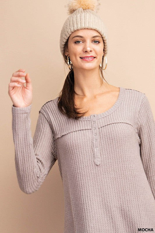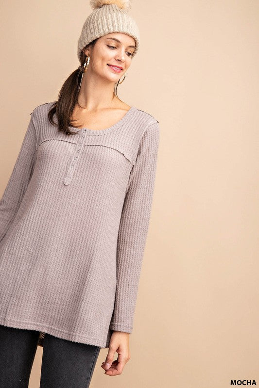 Brushed knit waffle top in the color mocha featuring snap buttons