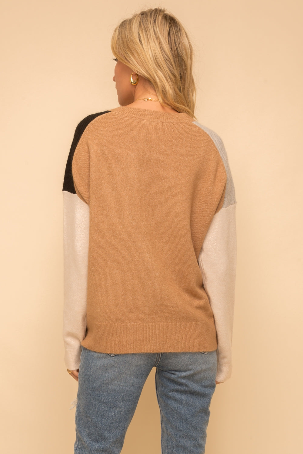 Color block cardigan featuring functional front buttons with the colors black, camel, grey, and cream.