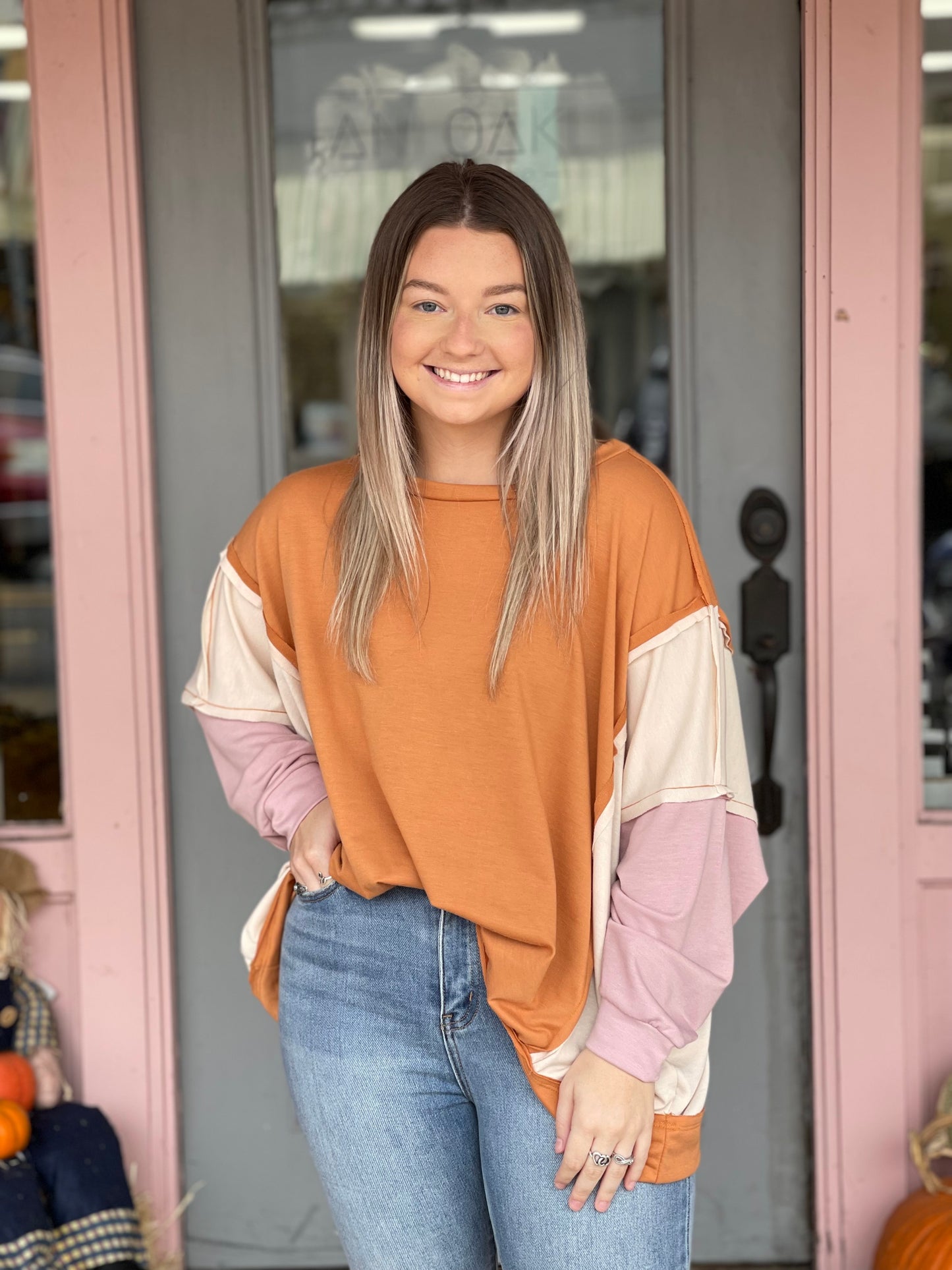 Long Sleeve Multi Color Blocked Knit Loose Fit Sweatshirt with Exposed Open Seam