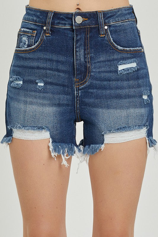 HIGH RISE FRONT DISTRESSED SHORTS INSEAM 3 1/2" RISE 11" IN SIZE S Height 5'8" | Waist 24" | Hips 33 1/2"