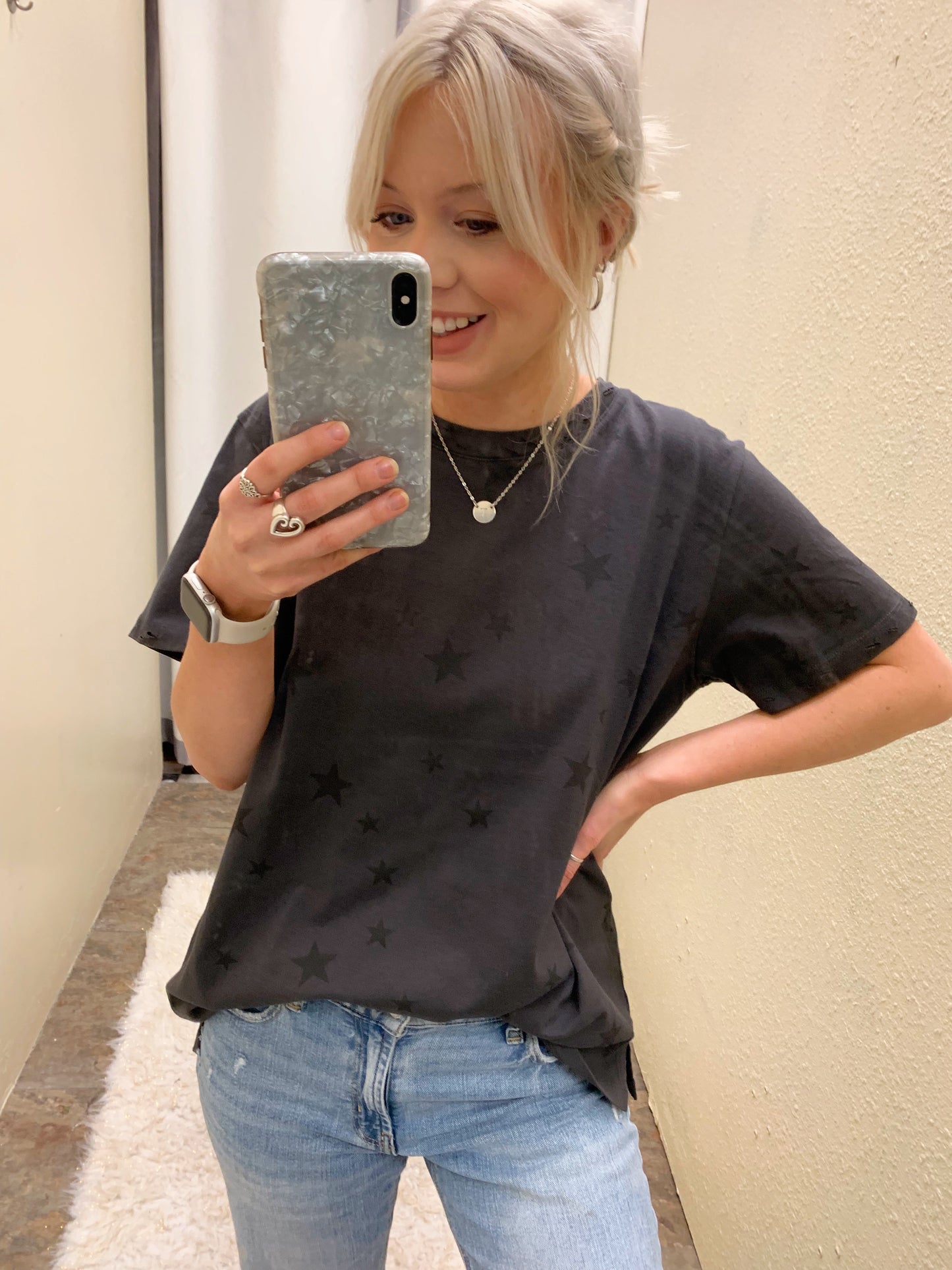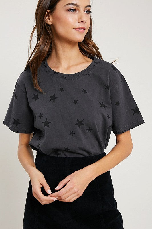 DISTRESSED HEM STAR T-SHIRT - SHORT SLEEVE - ROUND NECK 100% COTTON