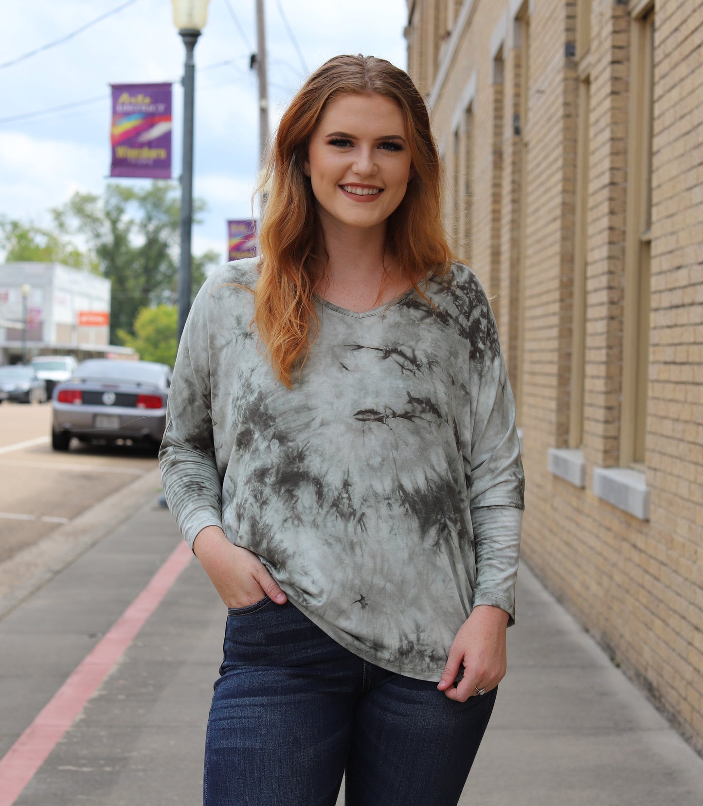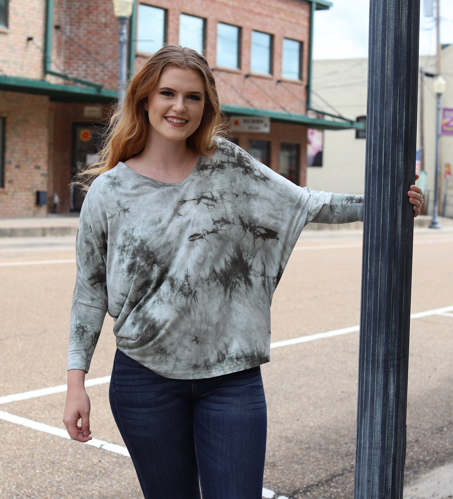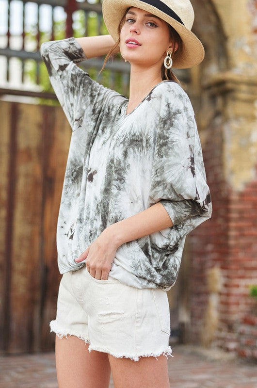 Lightweight olive tie dye top featuring a v neck and batwing style sleeves. A little longer in the back.
