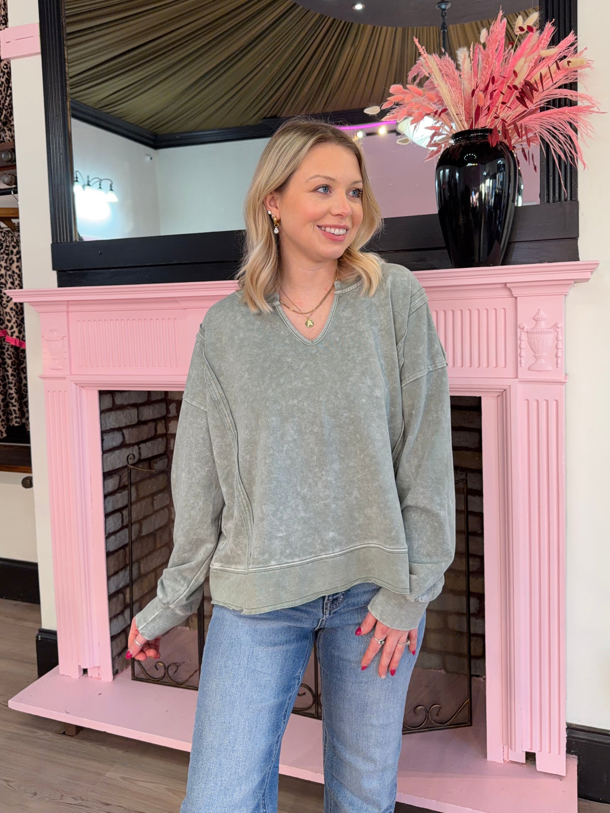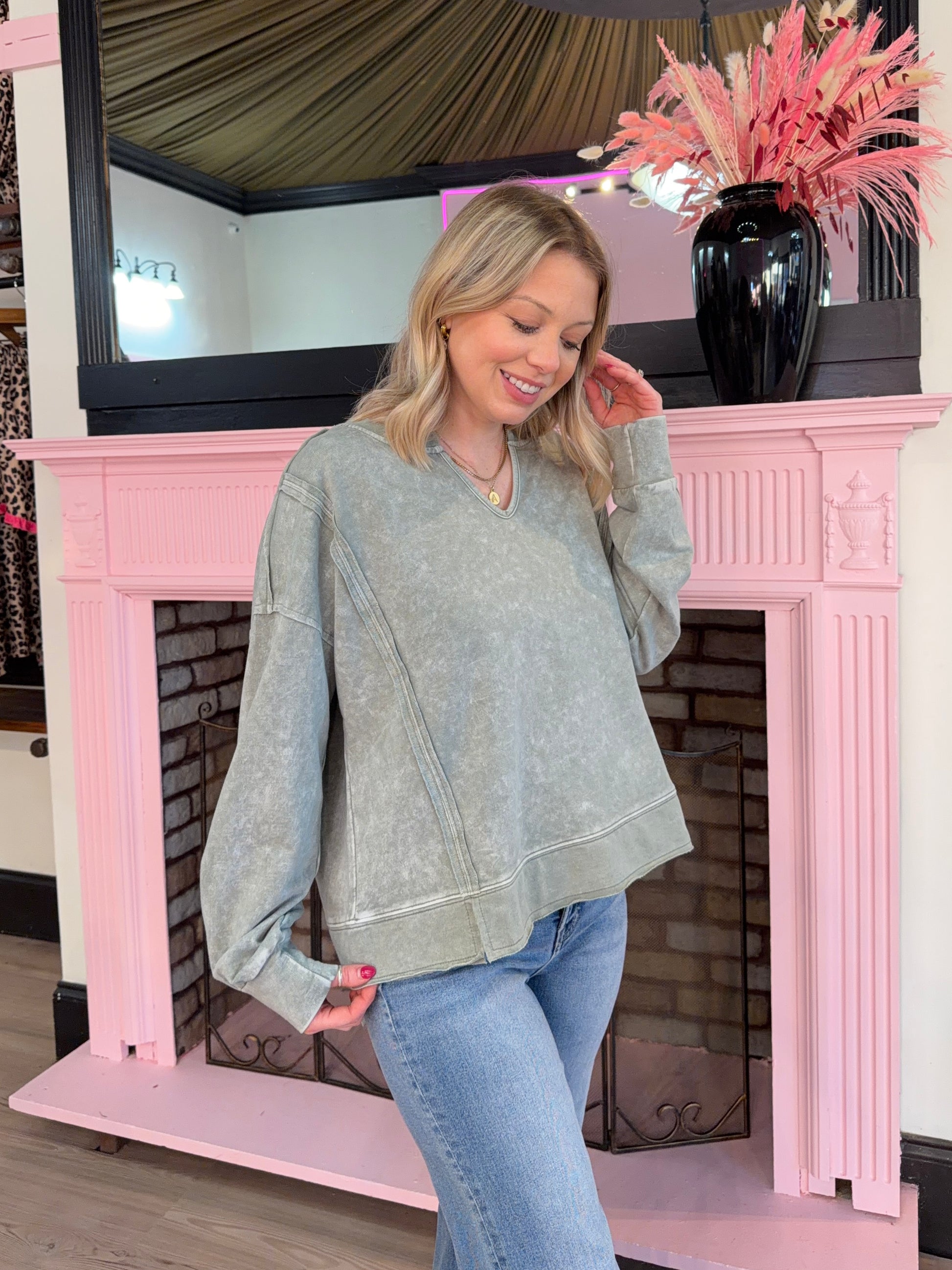 This washed V-neck sweatshirt is the definition of effortless comfort. Made with a soft, lived-in feel, it features a relaxed fit, drop shoulders, and subtle raw-edge details for an easy, everyday look. Perfect for layering or wearing on its own, this neutral pullover pairs seamlessly with denim and leggings for a cozy, casual vibe you’ll love year-round.