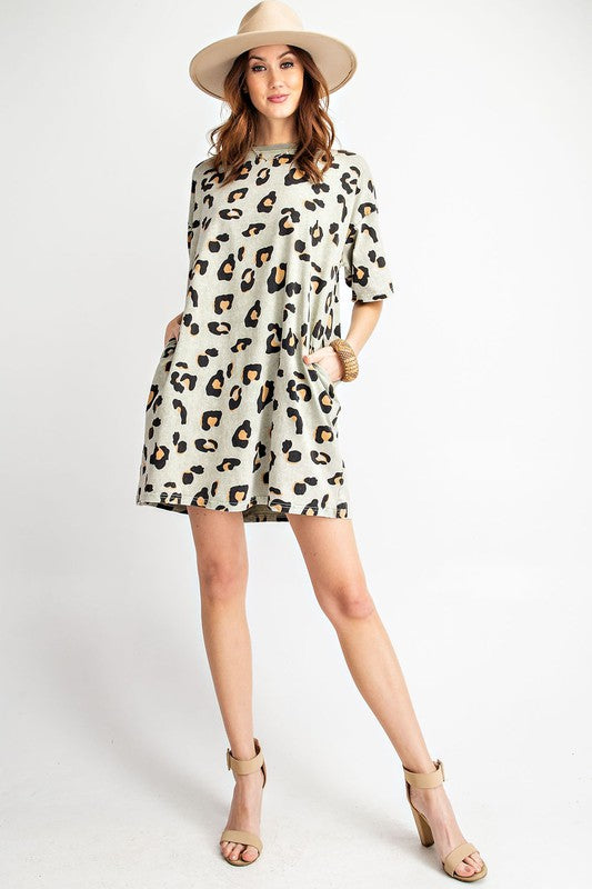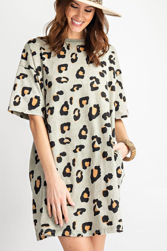 Faded sage tee shirt dress with leopard print. Features an oversize fit and side pockets. This dress is perfect to throw on and go for an casual and effortlessly cute look!