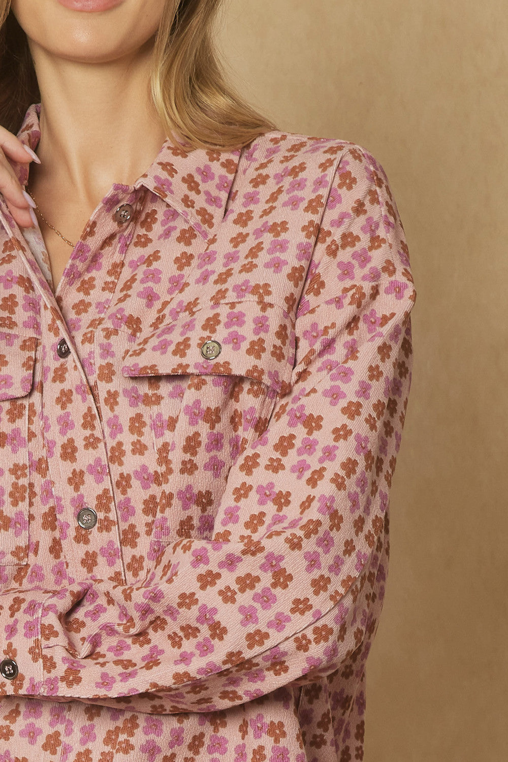 Floral print corduroy collared button up long sleeve top featuring pockets at bust. Unlined. Woven. Non-sheer. Lightweight.