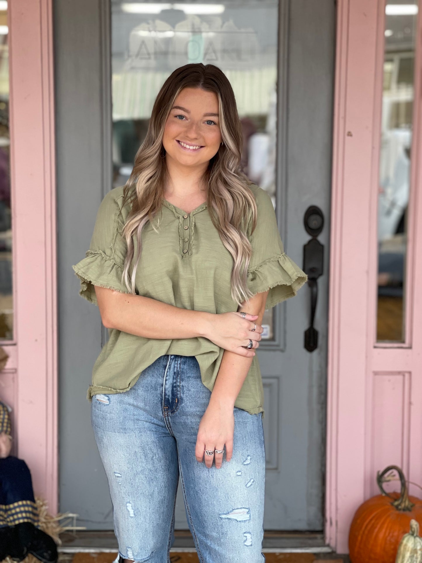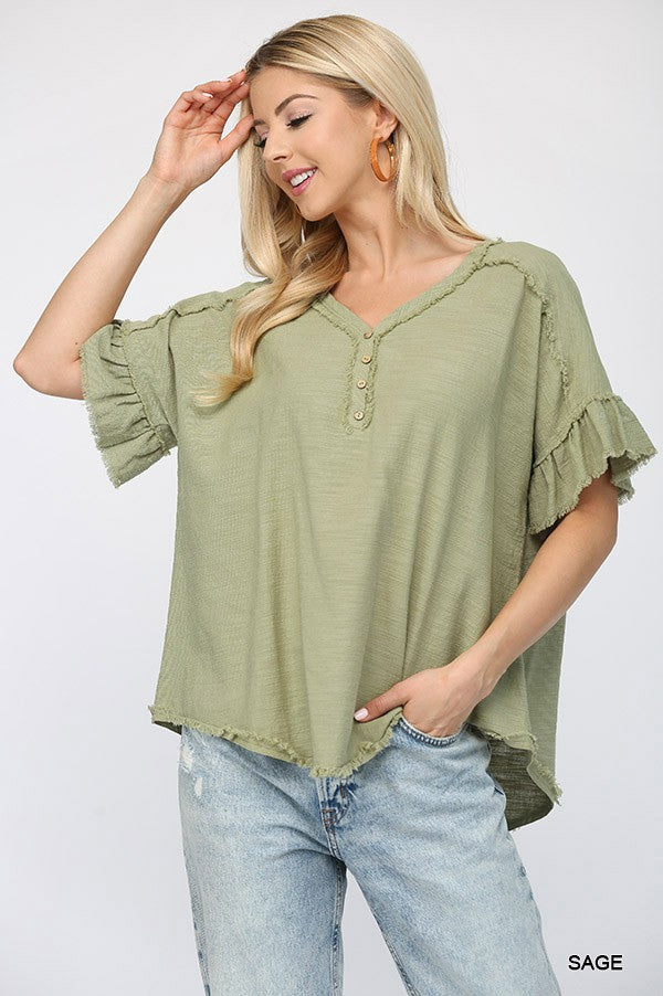 Frayed and washed linen V-neck top with ruffle sleeves.