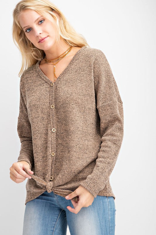 A comfy and cozy go-to fall/winter top! Features a two-tone boucle material with buttons and a front knot.