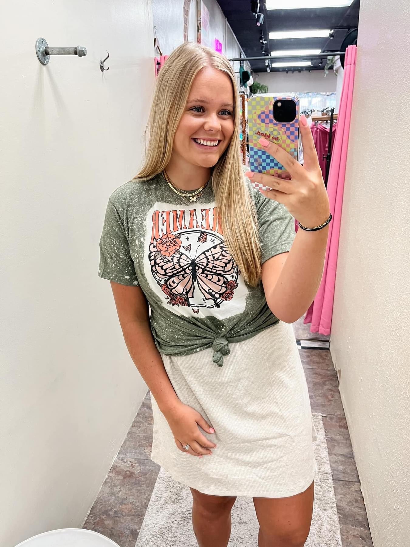 -RIB KNIT FABRICATION - V-NECK -SHORT SLEEVE -MINI LENGTH -STRAIGHT HEMLINE