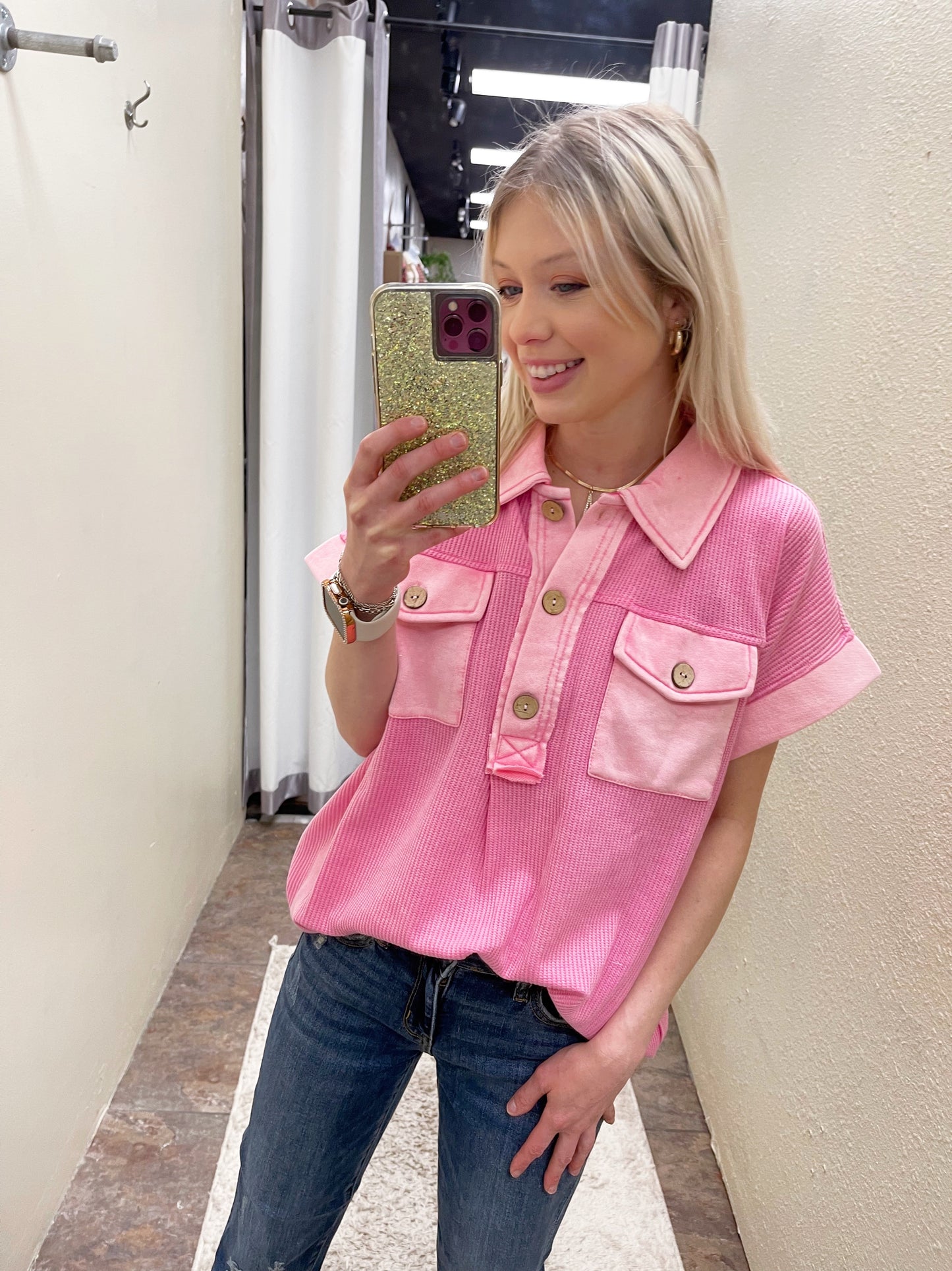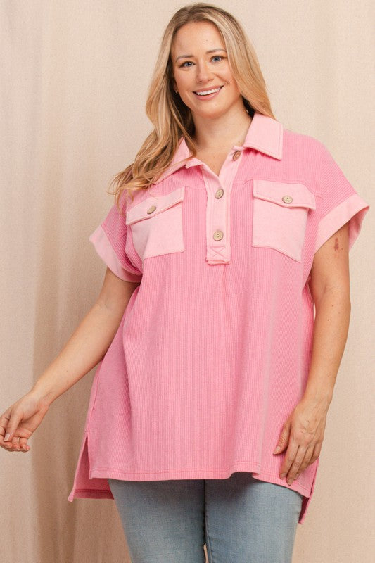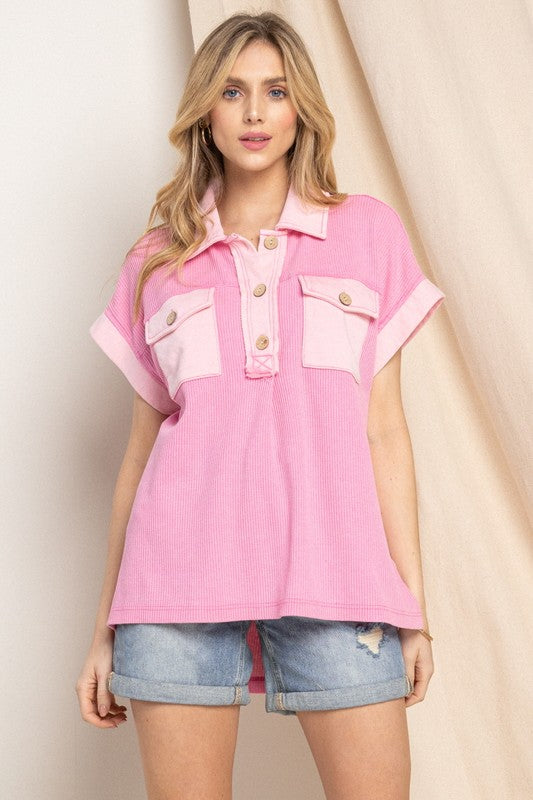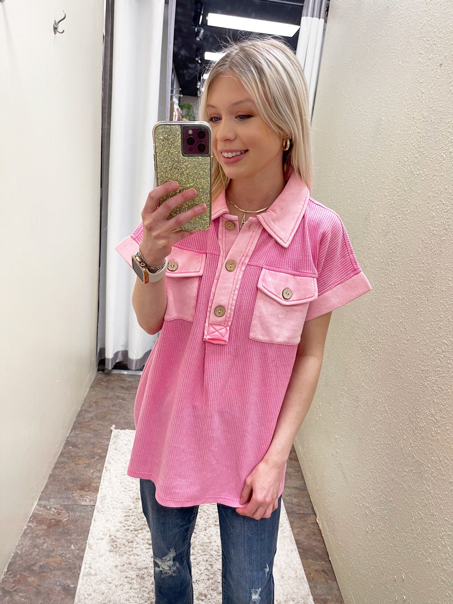 Washed oversized pullover top featuring Henley neckline, brast pockets, drop shoulder and short sleeves.