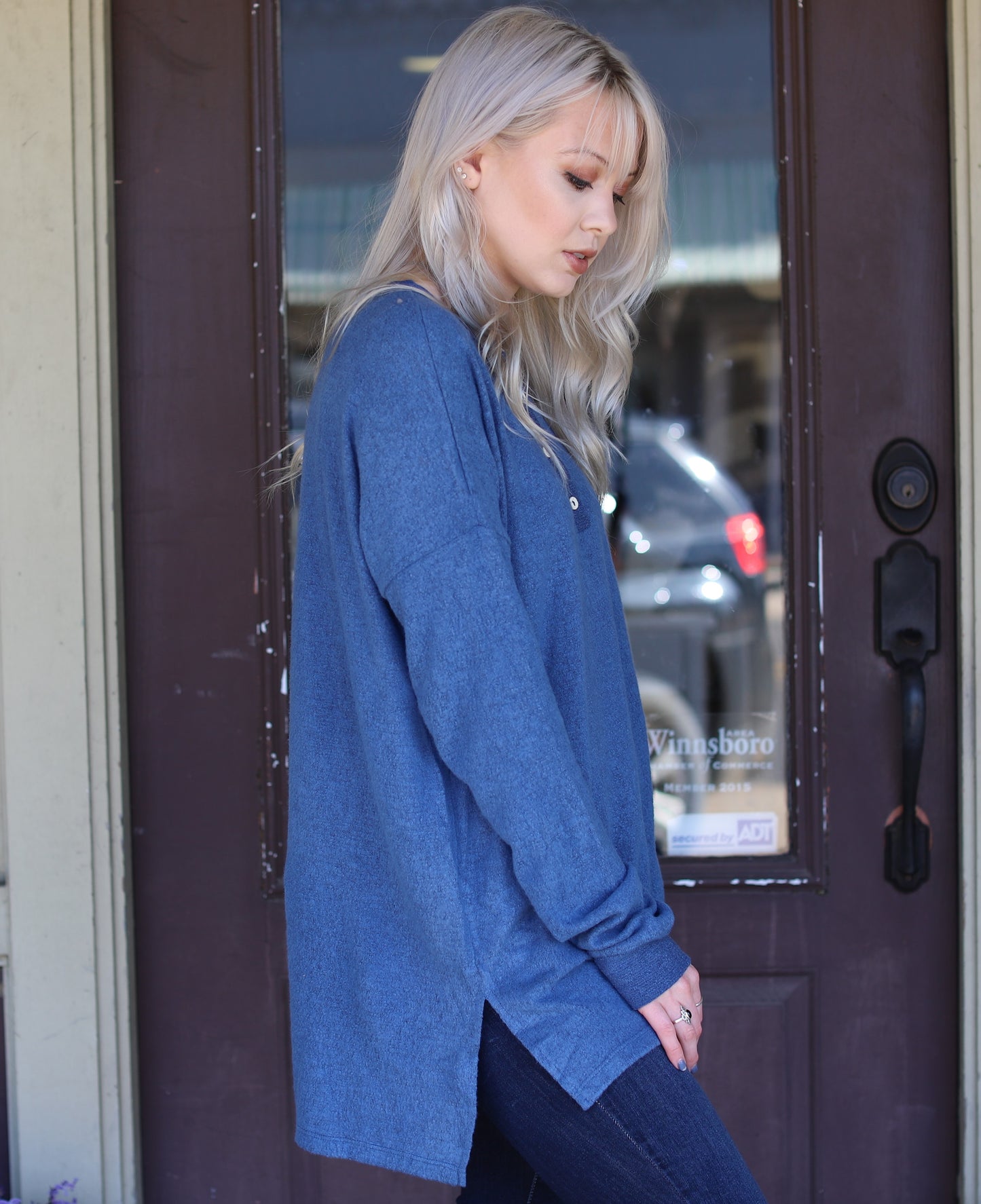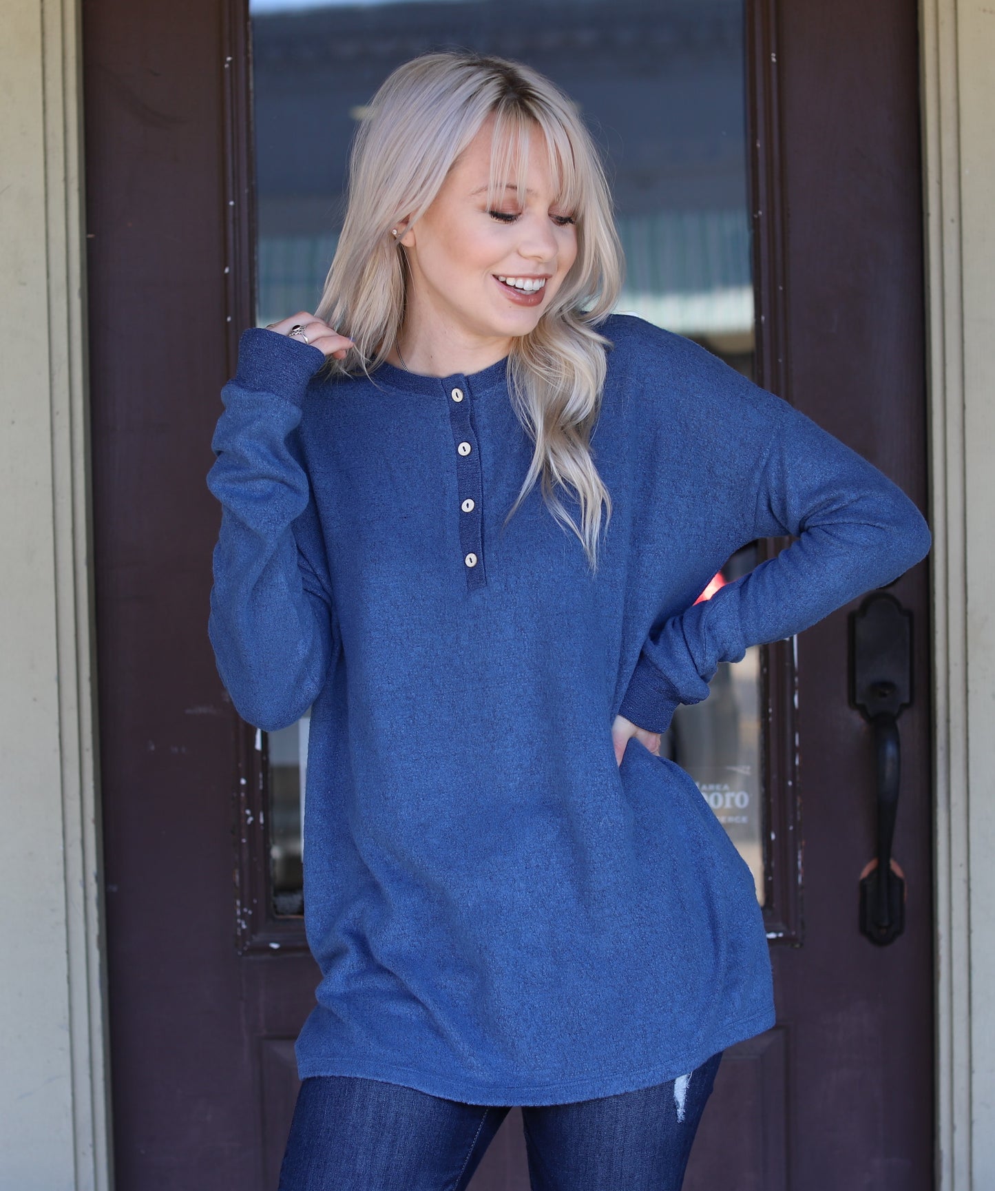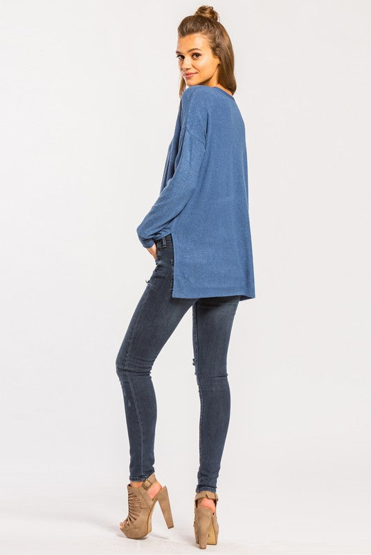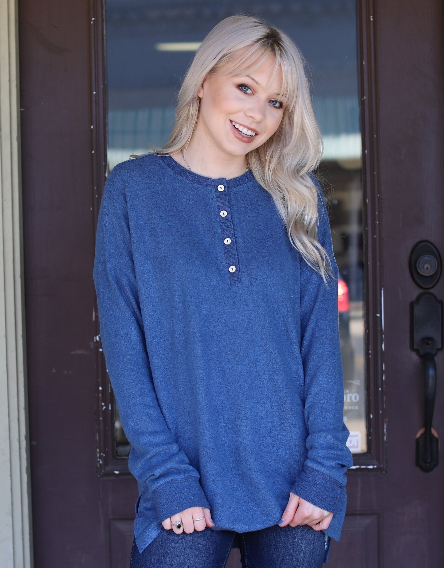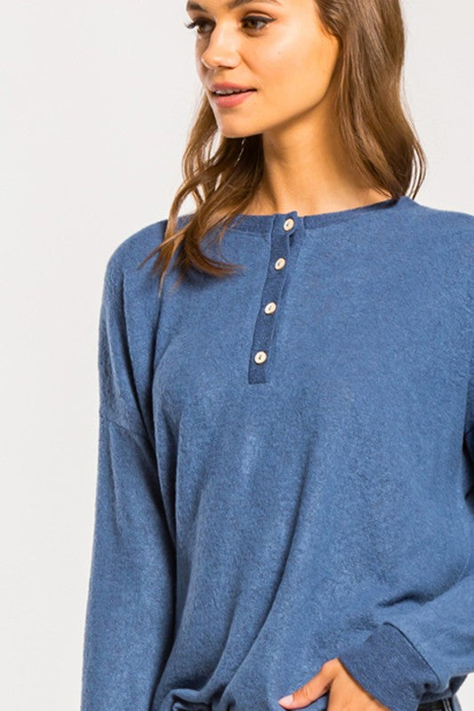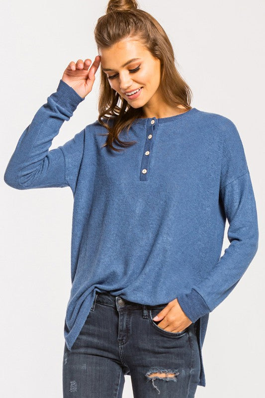 Brushed henley long sleeve knit top. This top features a gorgeous blue color, semi-loose fit, round neck, functional buttons, and side slits.