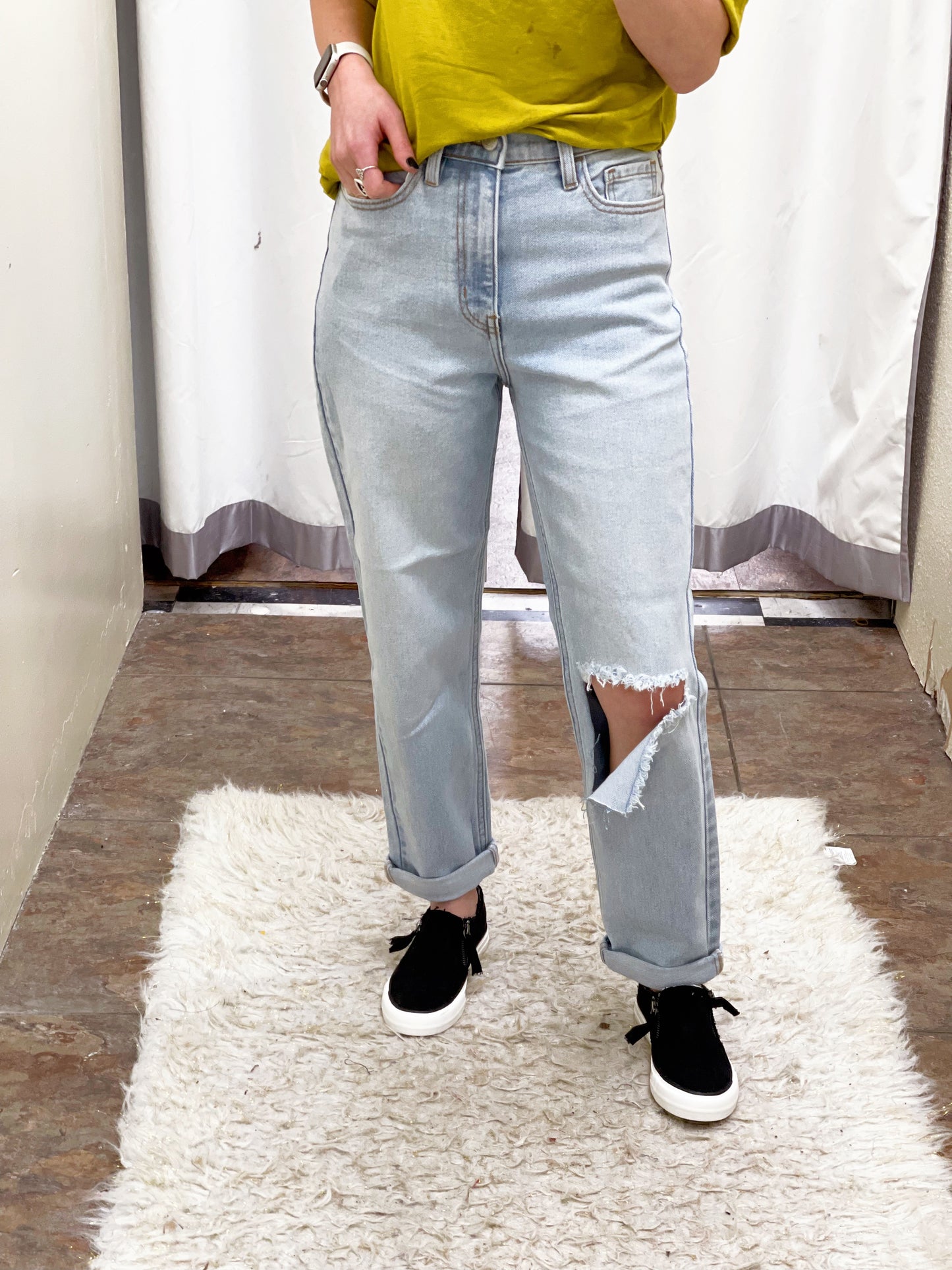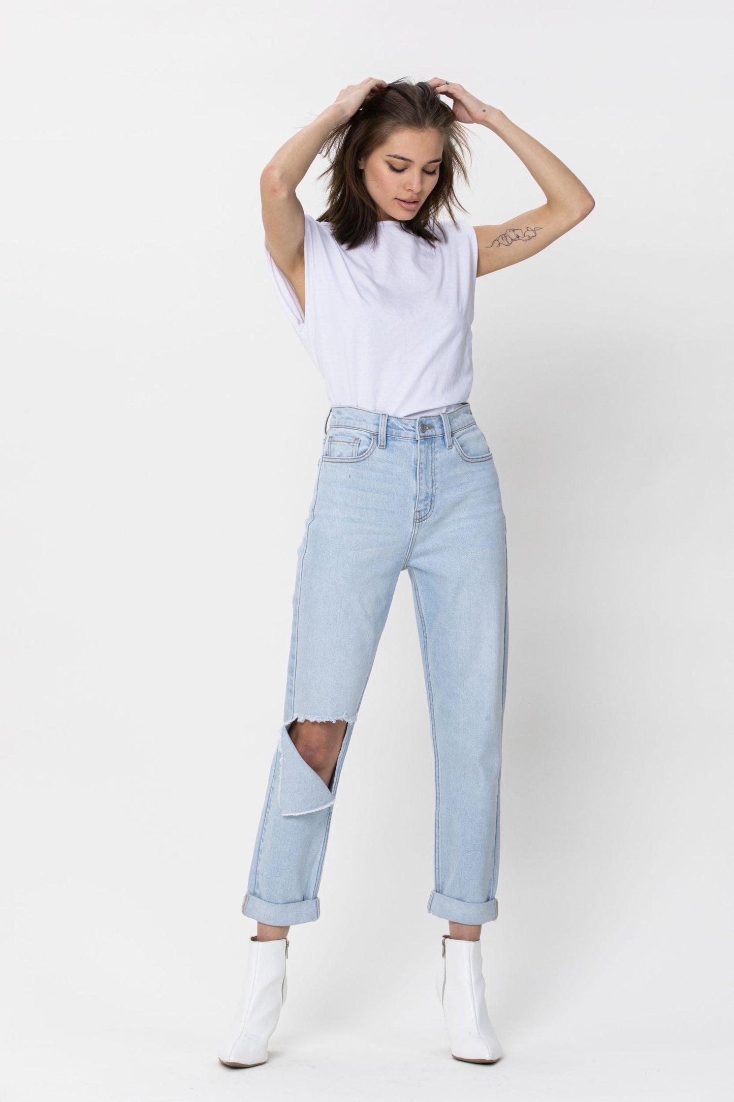 Relaxed through the thigh and tampered from knee to ankle, these mom jeans feature stretch denim in a light wash, flattering high rise waist and double rolled hem.