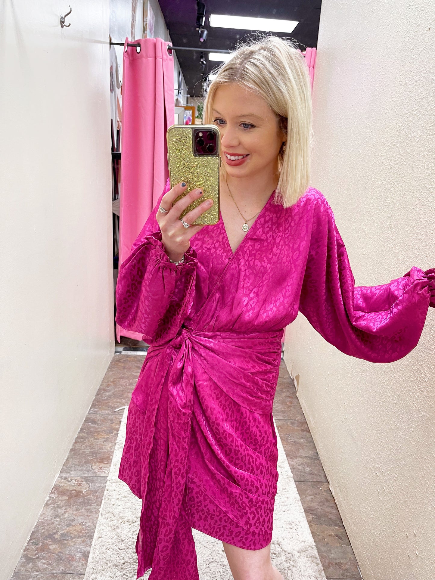 A long sleeve cheetah print woven dress with a surplice front featuring elasticized bishop sleeves, a front adjustable wrap tie overlay and an invisible zipper. Fabric is a lightweight woven jacquard.