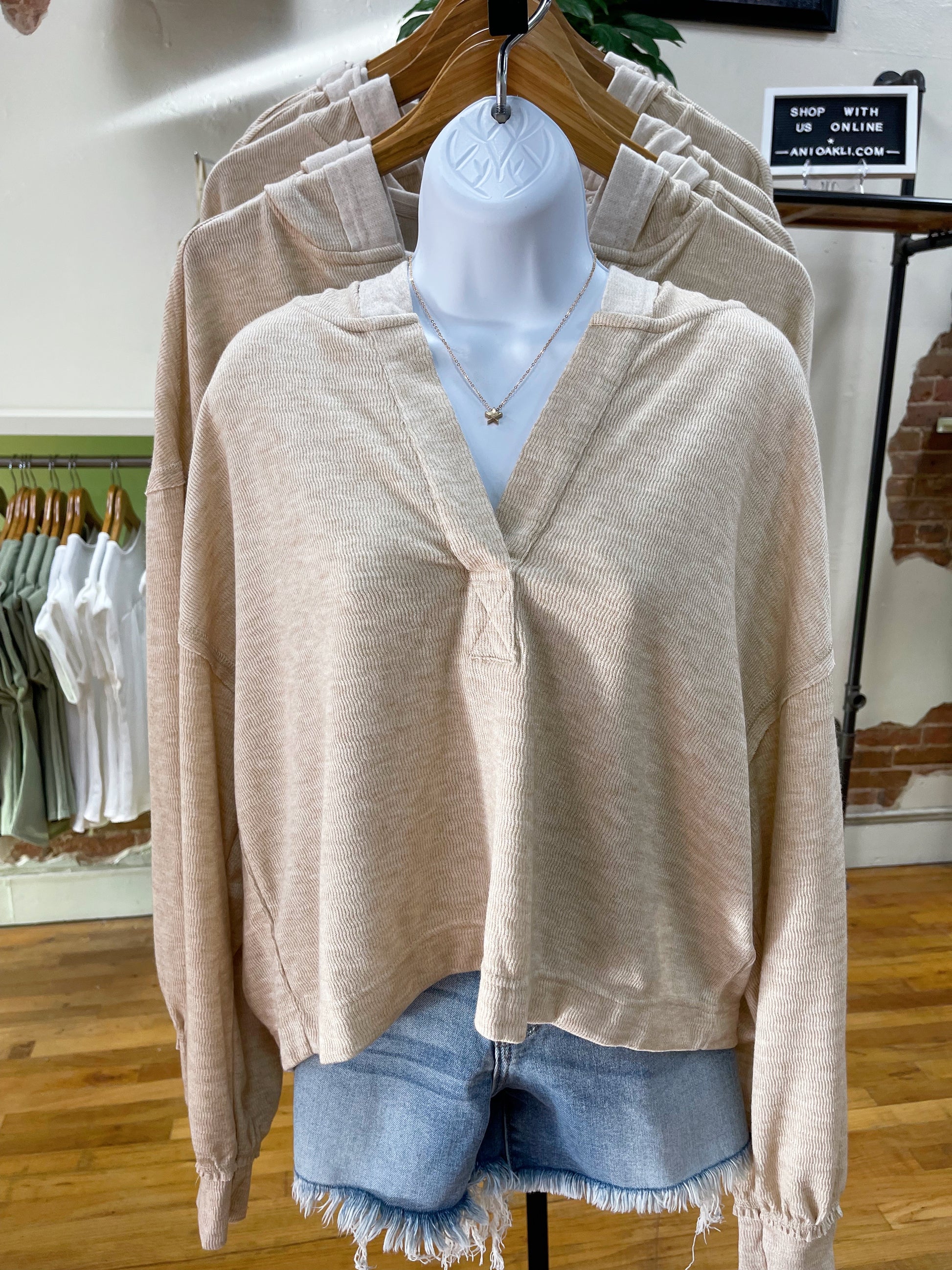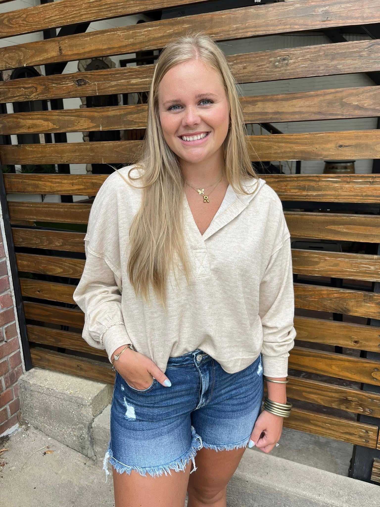 This lightweight knit hoodie is the perfect blend of comfort and style. With its soft oatmeal hue, relaxed fit, and casual drop shoulders, it’s an effortless piece you can throw on with shorts now or layer later. Features a subtle v-neckline with hood detail and easy-to-style long sleeves.