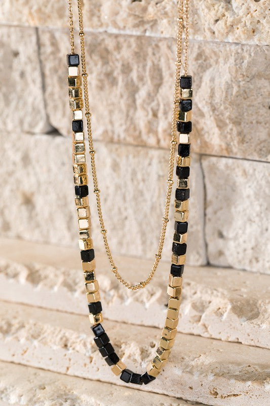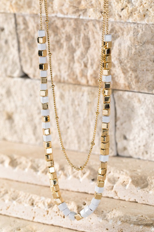 Double layer delicate chain with golden toned and color cube bead and lobster closure short necklace