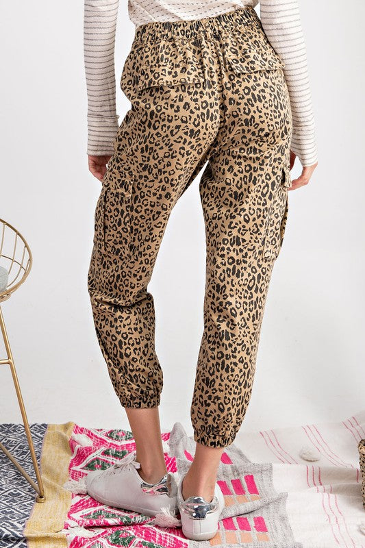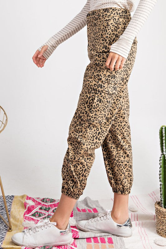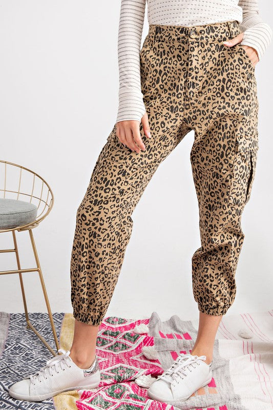 Leopard print cargo pants featuring a high rise, slouchy silhouette, 4 pockets, elastic hem, and button closure and zip fly.