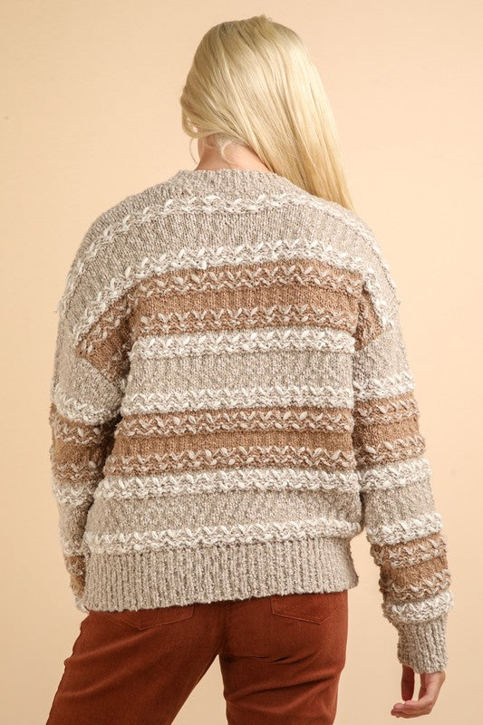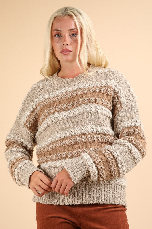 - Color Block Fuzzy Knit Sweater Top - Oversized - Drop Shoulder - Long Sleeve - Round Neck