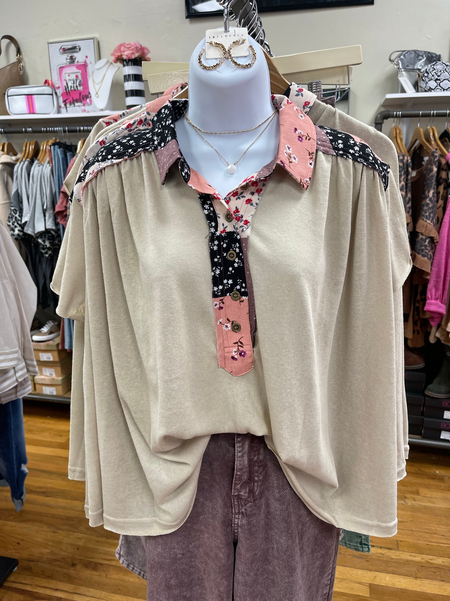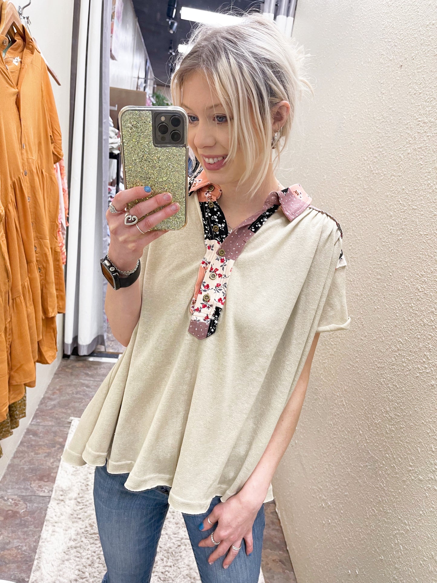 SHORT SLVS SWING TOP -PRINTED COLLAR DETAILING -BOXY SILHOUETTE -ULTRA LIGHTWEIGHT -BUTTON DOWN FRONT