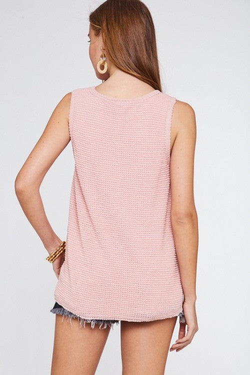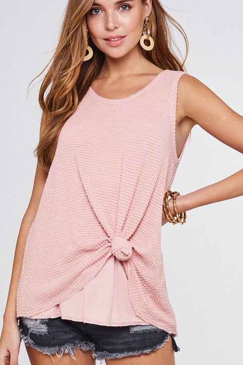 We are in LOVE with this tank! So casual yet stylish. This lightweight waffle knit tank has the cutest front knot detail.