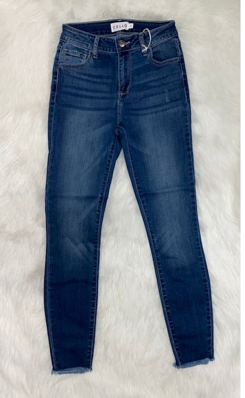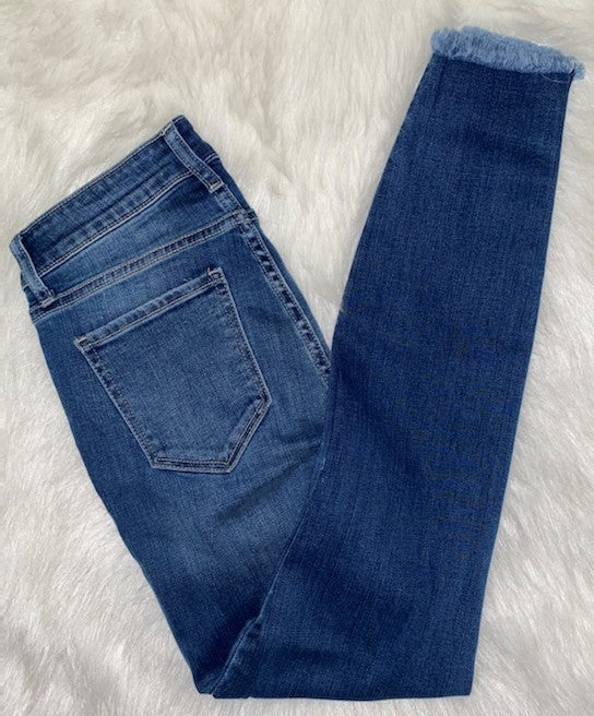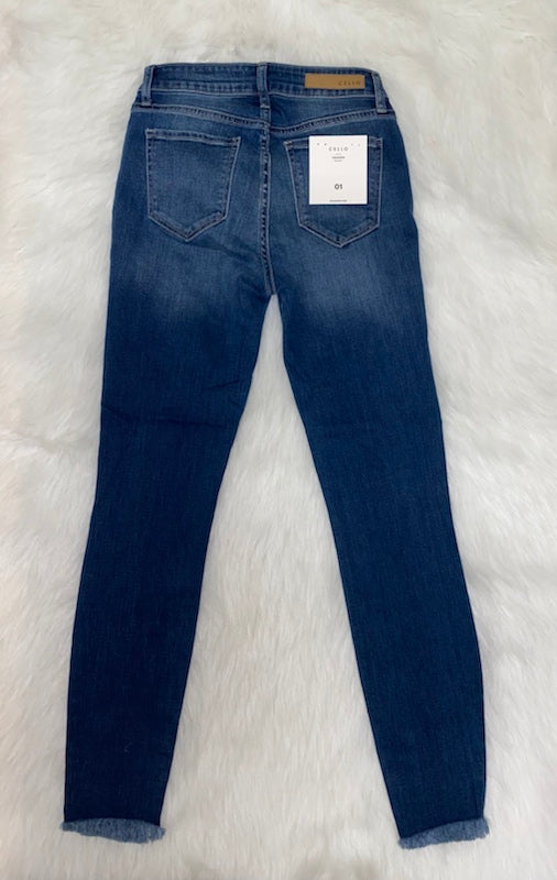 These mid rise skinny jeans are made to stretch and keep its shape as you move. These jeans have a small rip at the top and some distressed details on both legs. True to size.