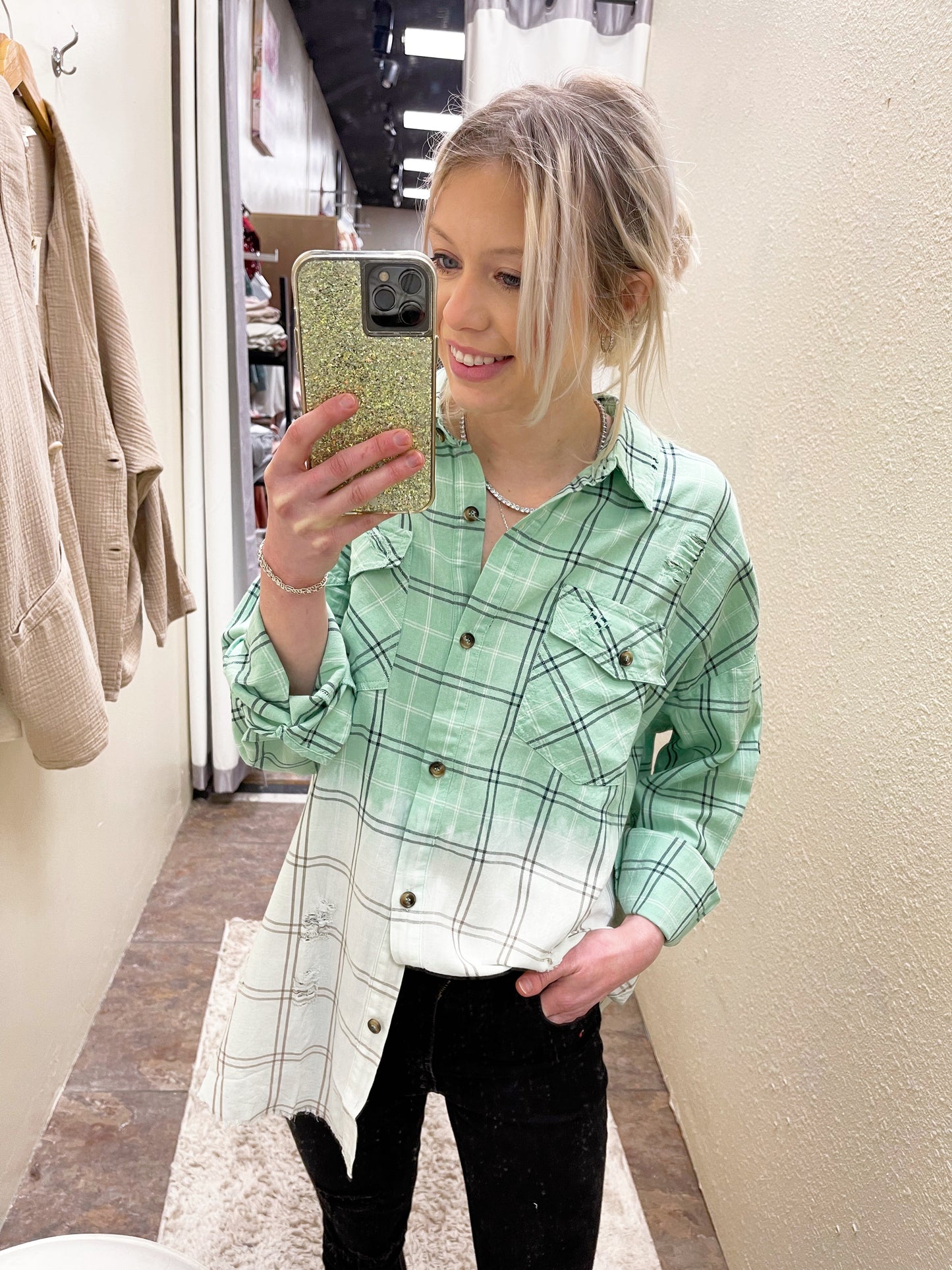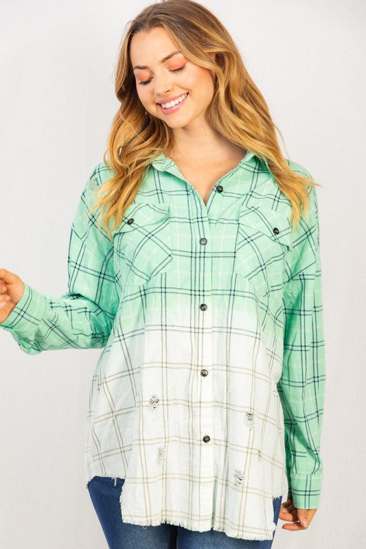 A long sleeve dip dyed windowpane plaid woven top with a buttoned own front featuring