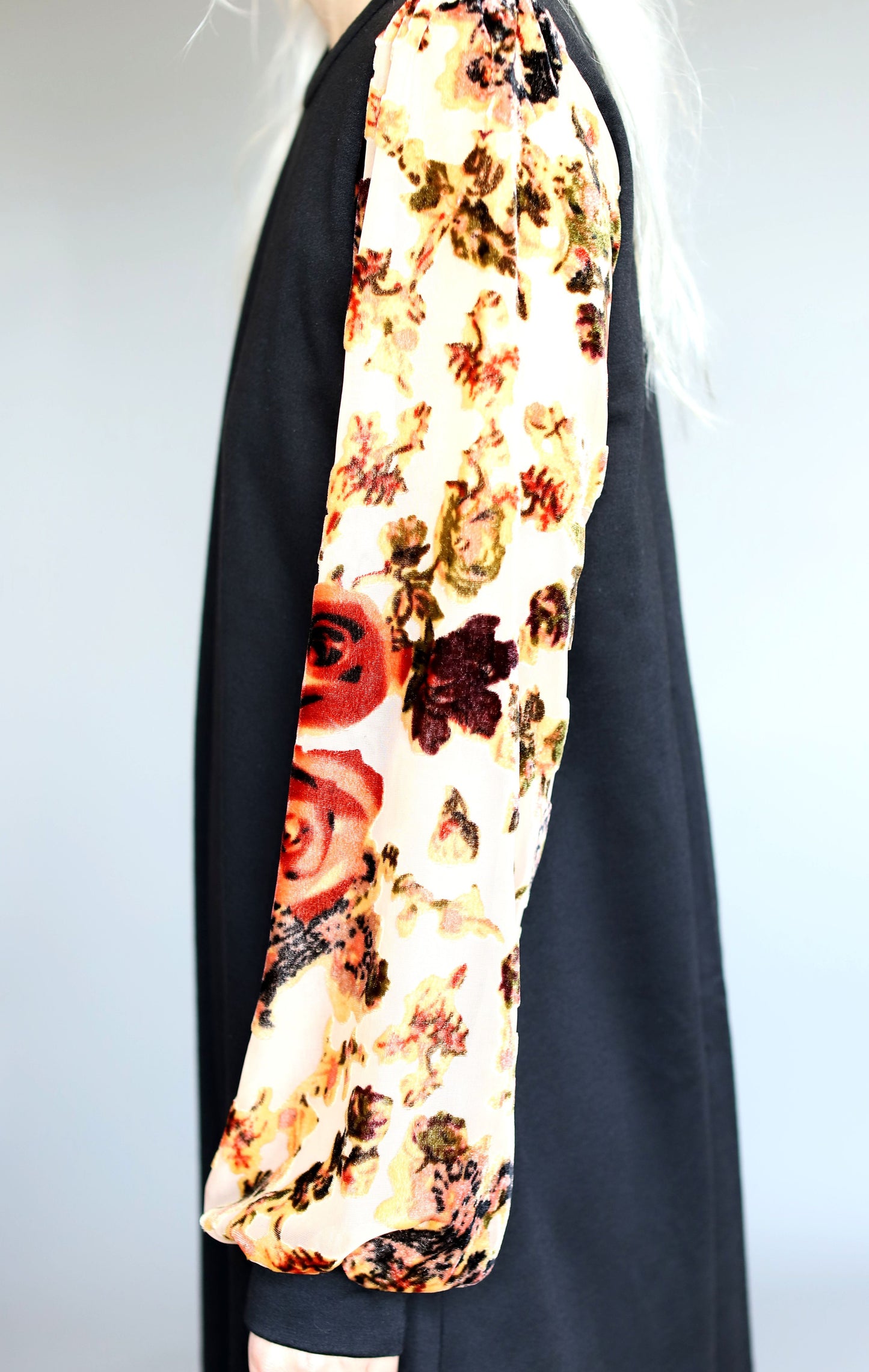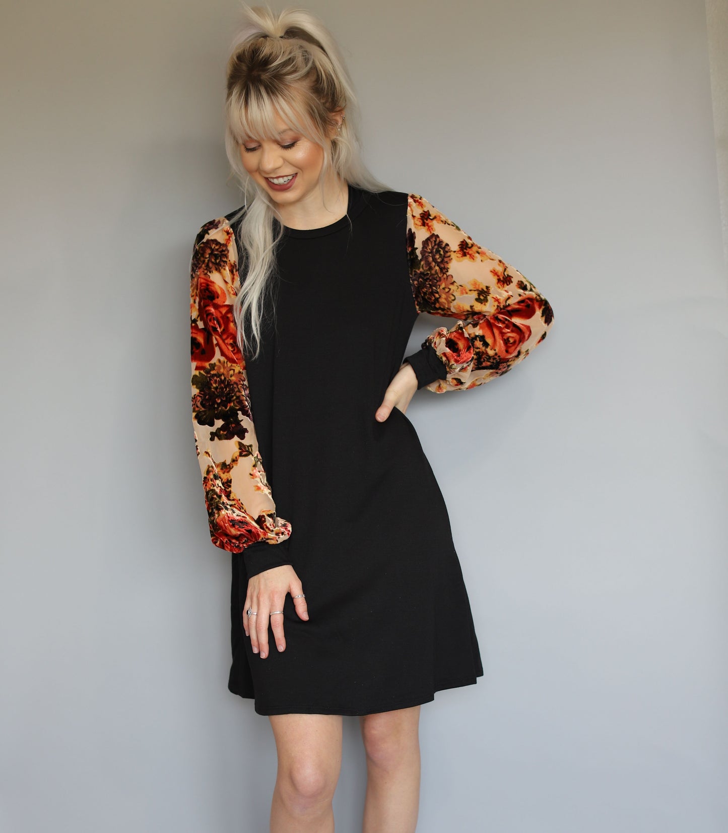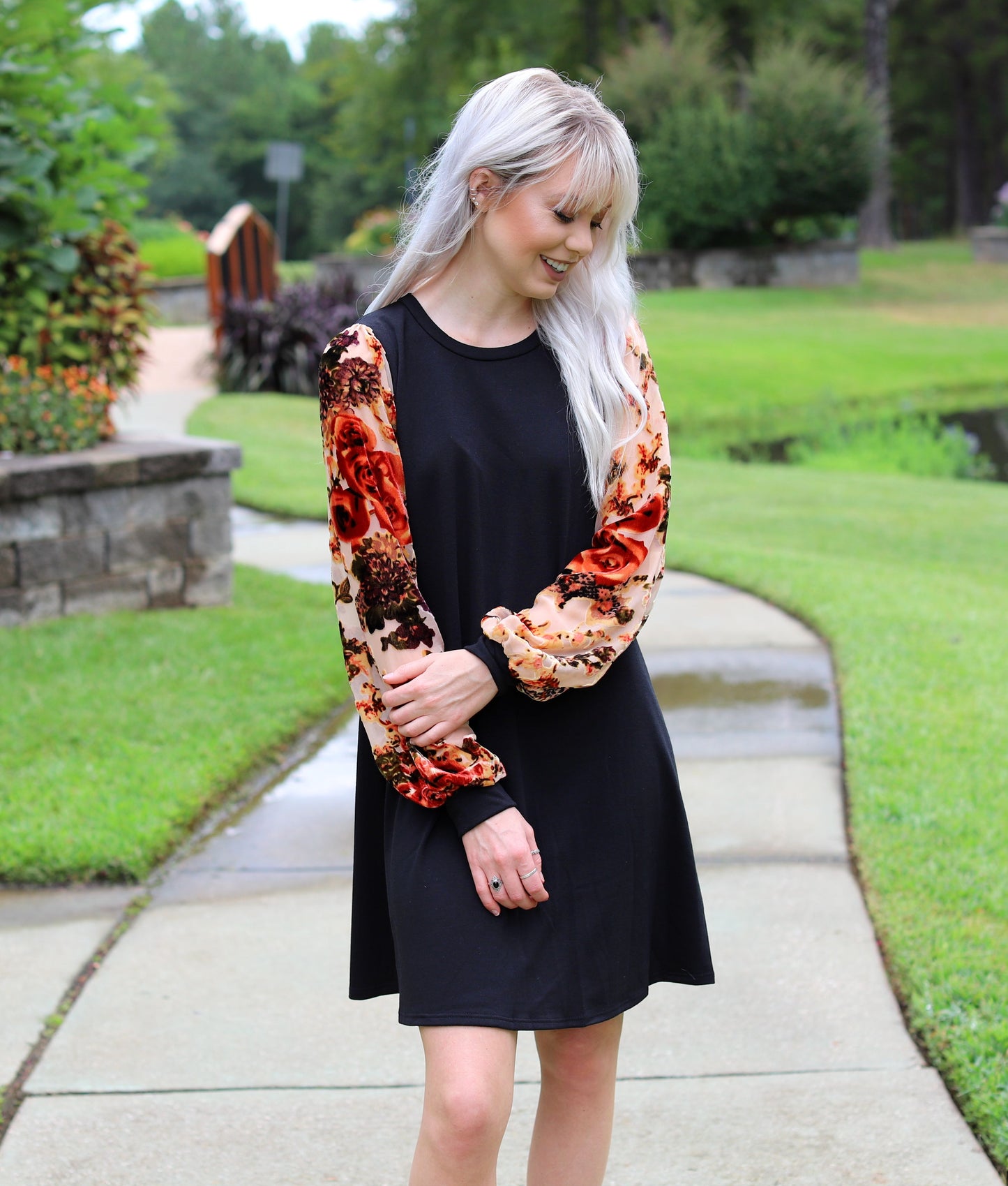 Embroidery mesh sleeve shift dress. Perfect dress to pair with booties for a cute fall look.