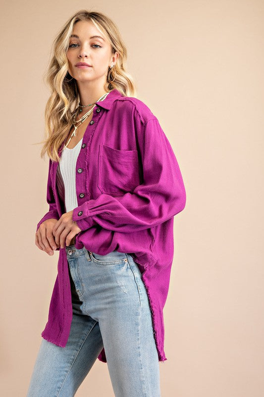 SOLID TWILL VINTAGE HEM DETAILS CHEST POCKETED HI-LOW CURVE HEM