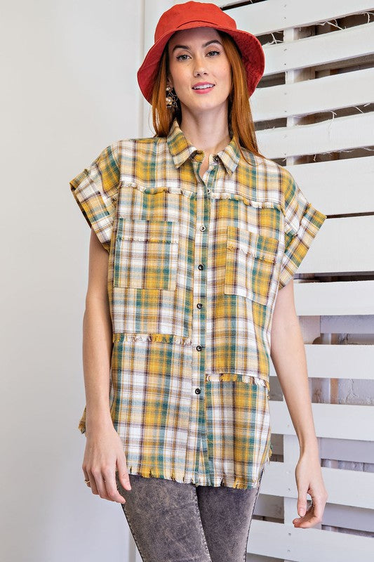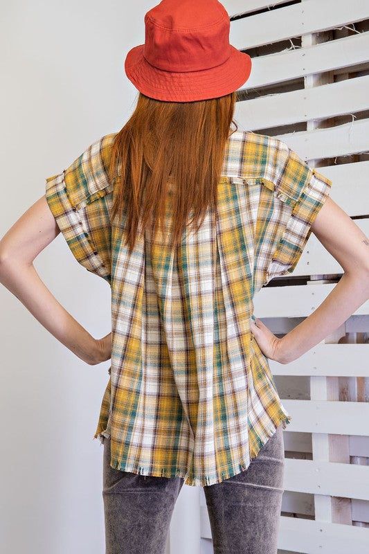 SHORT SLVS PLAID SHIRT -COLLARED NECKLINE -BUTTON DOWN FRONT -RAW EDGES -PLAID PRINT DESIGN -BOXY AND LOOSE FIT -CAP SLEEVES -CHEST PATCH POCKETS -PLEATED BACK