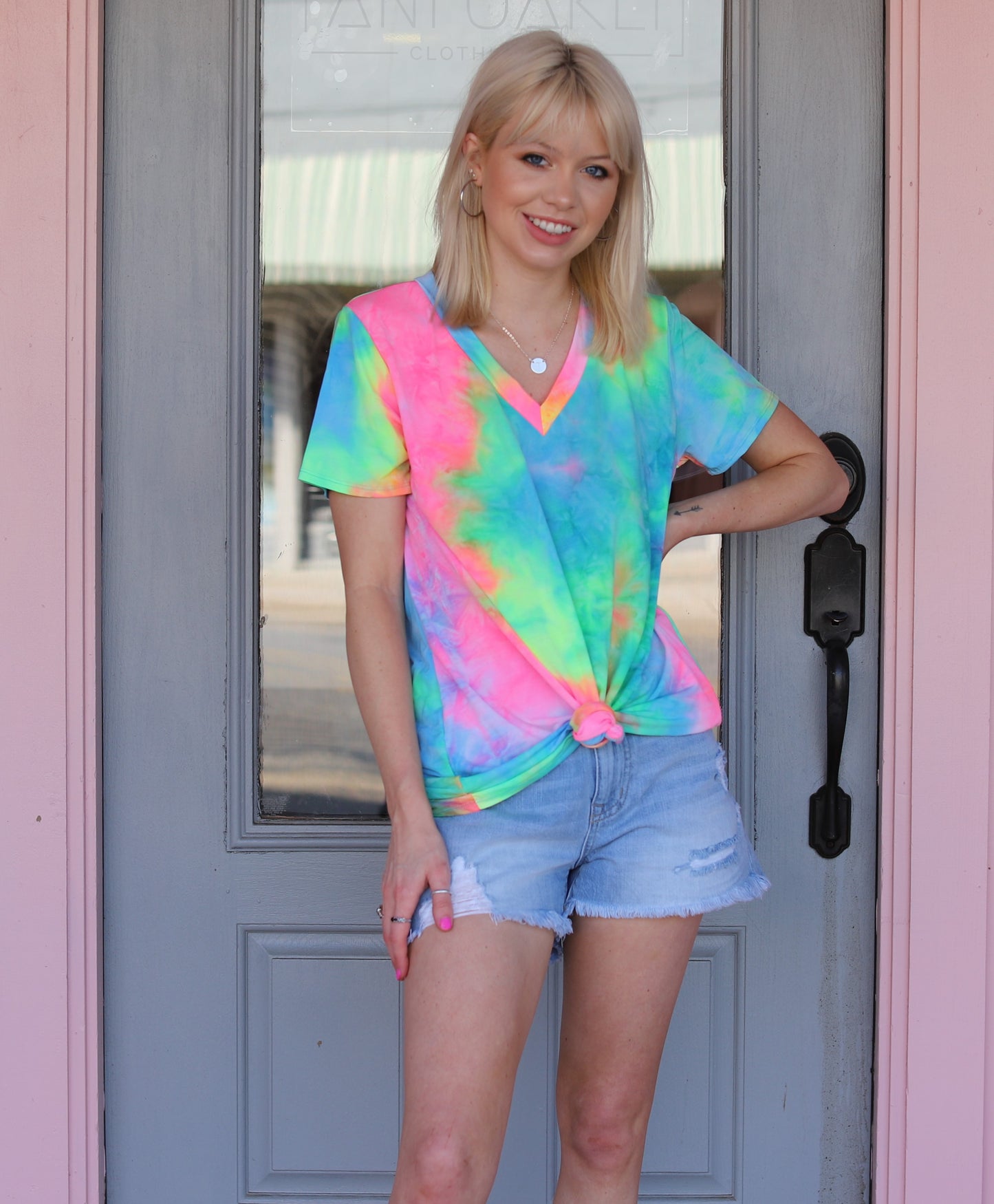 If you haven't noticed yet, tie dye is very TRENDY this spring & summer! Add this neon tie dye top to your wardrobe for a pop of color this season! Features a thin comfy material and v neckline.