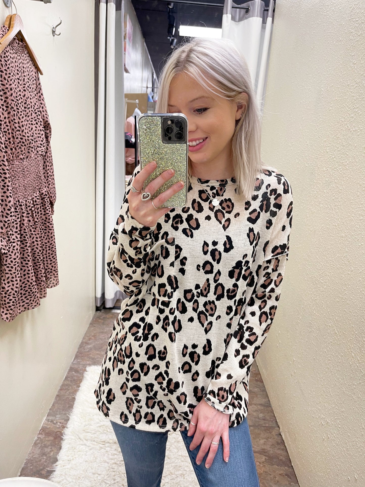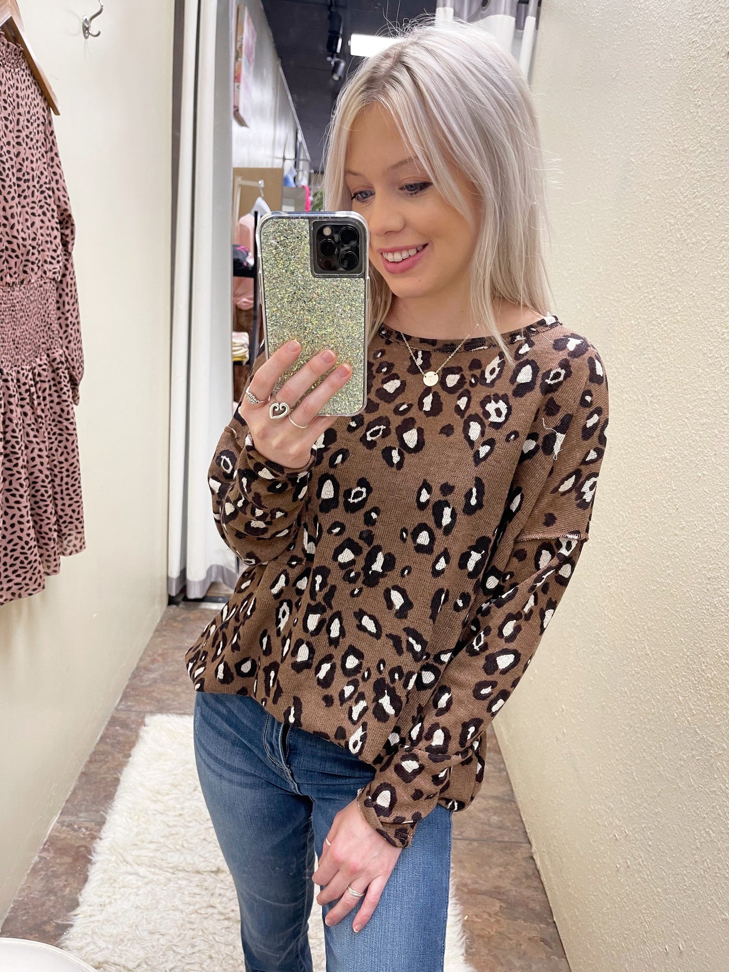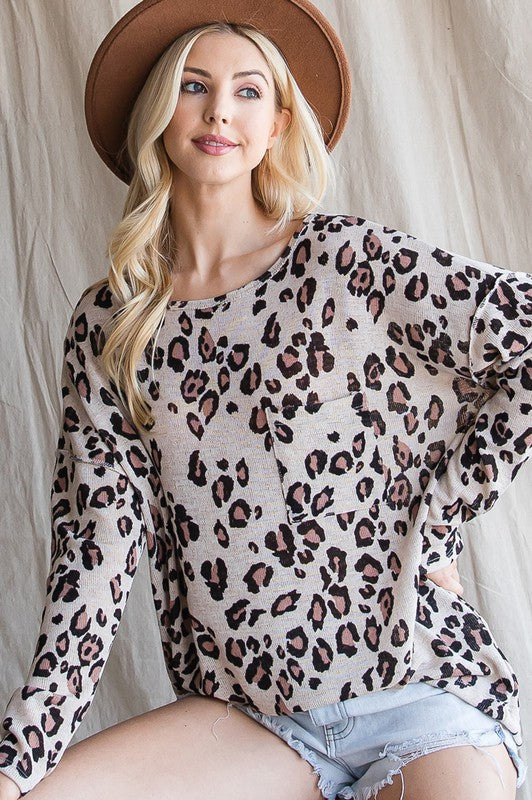 LEOPARD PRINT LONG SLEEVE TOP WITH BOAT NECKLINE AND POCKET ON THE FRONT. THIS TOP CAN BE DRESSED UP OR DOWN.