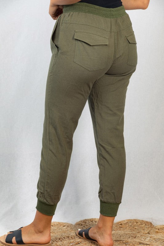 A high-waisted solid woven jogger with an elastic waist featuring pockets and an adjustable drawstring. Fabric is a lightweight linen.