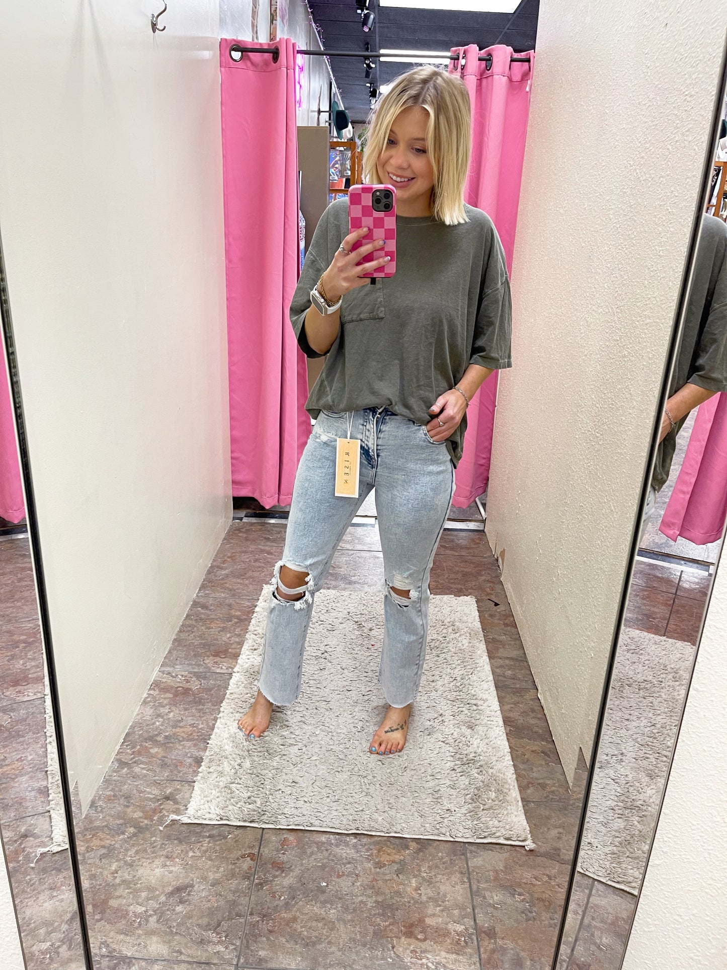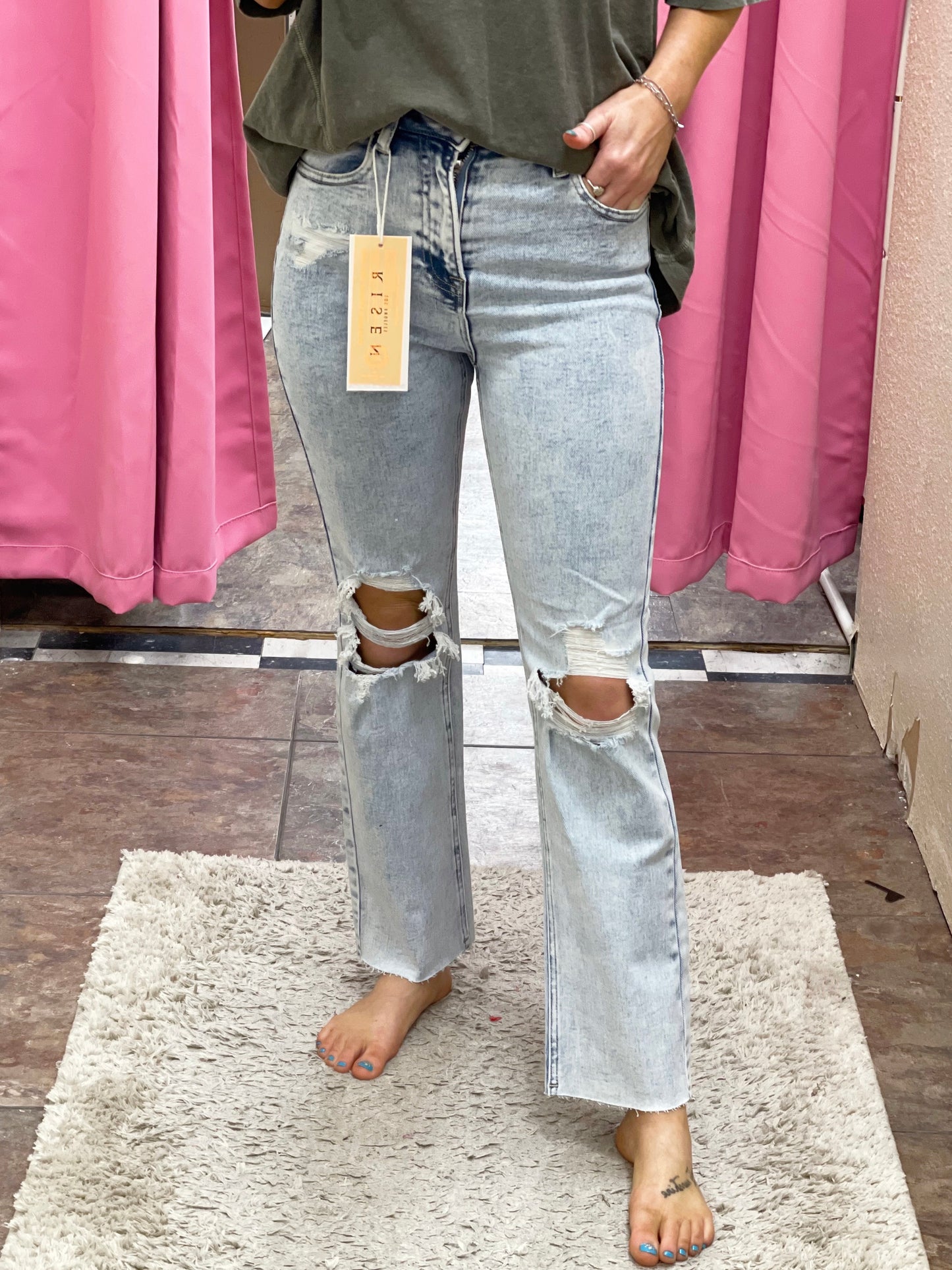HIGH RISE KNEE DISTRESSED ANKLE JEANS - Rise: 10 1/2" | Inseam: 27 1/2" in size 3/26 - Model Info: Height 5'7'' | Waist 25" | Hips 34"