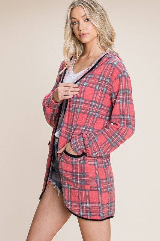 Red Plaid Hooded Cardigan