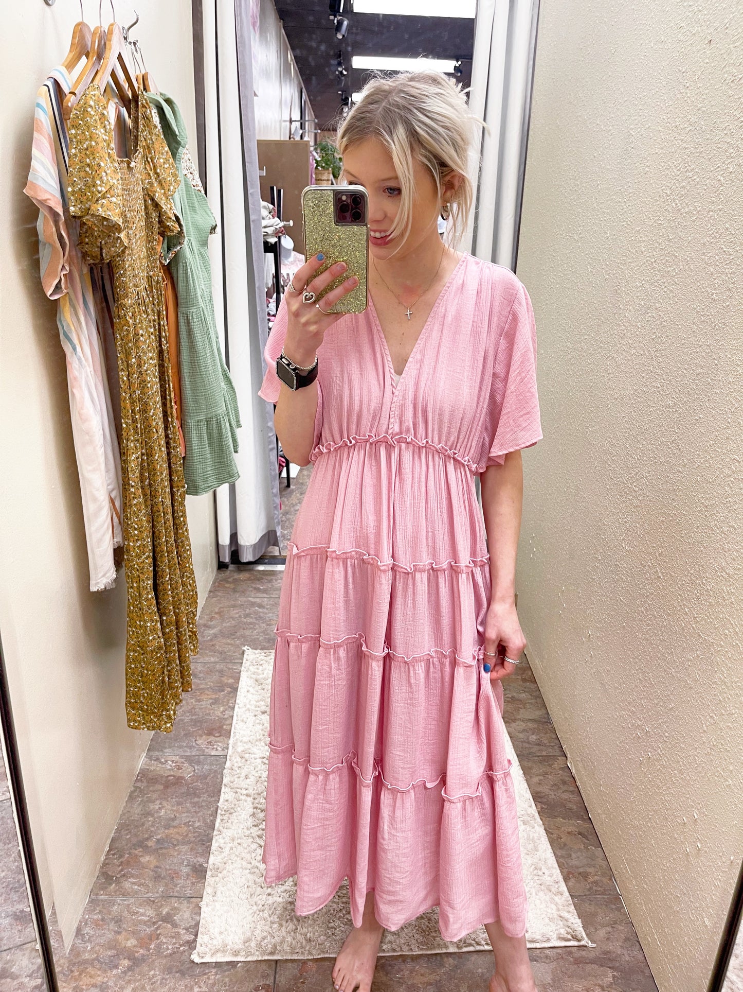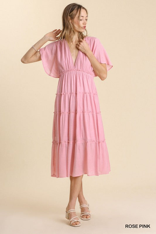 Smocked Short Sleeve V-Neck Textured Tiered Maxi Dress