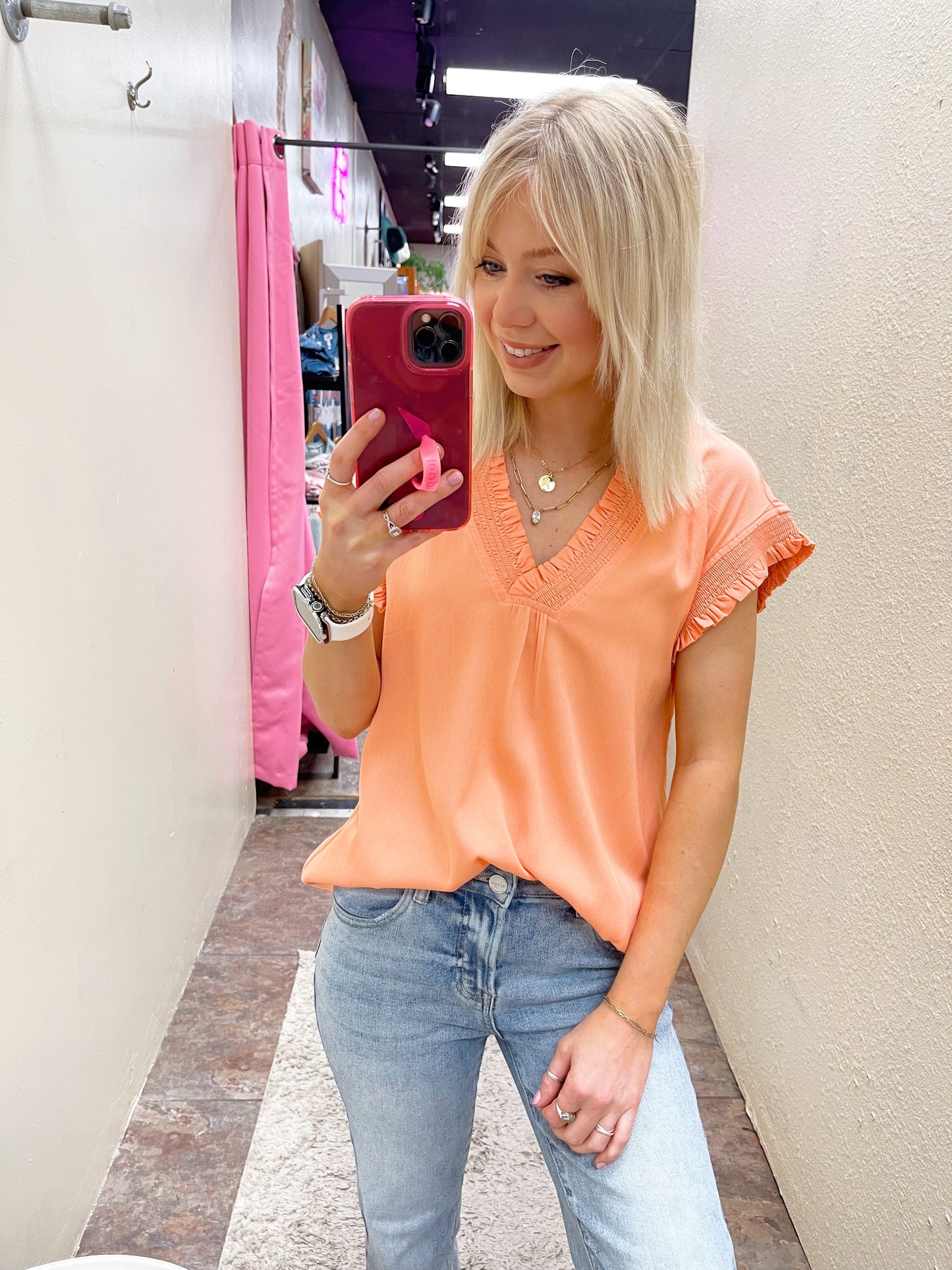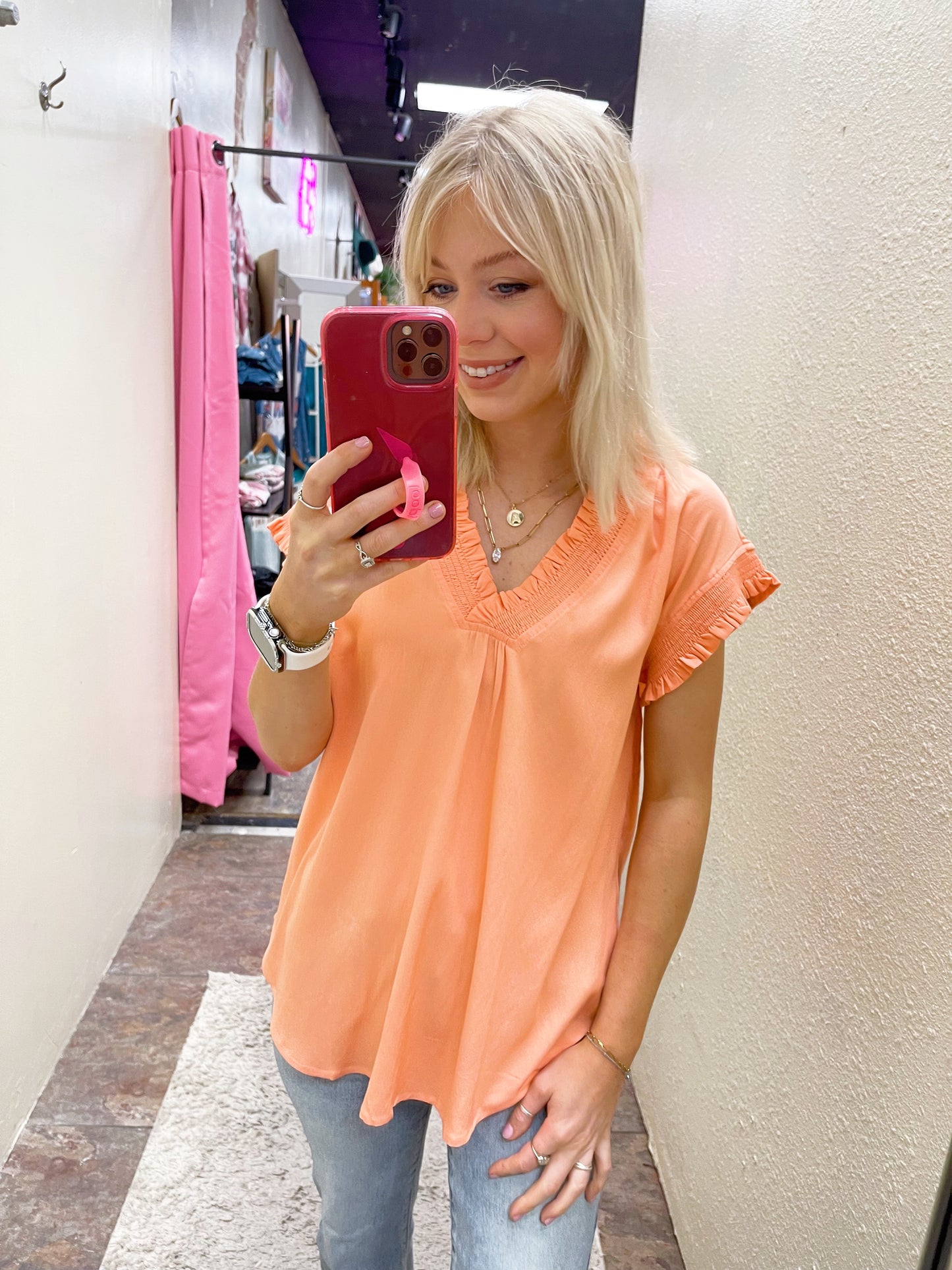 SOLID COLOR ROUND HEMLINE TOP FEATURING RUFFLE SMOCKED V NECK, RUFFLE SMOCKED SLEEVES, AND SHIRRING DETAIL ON THE FRONT AND BACK.