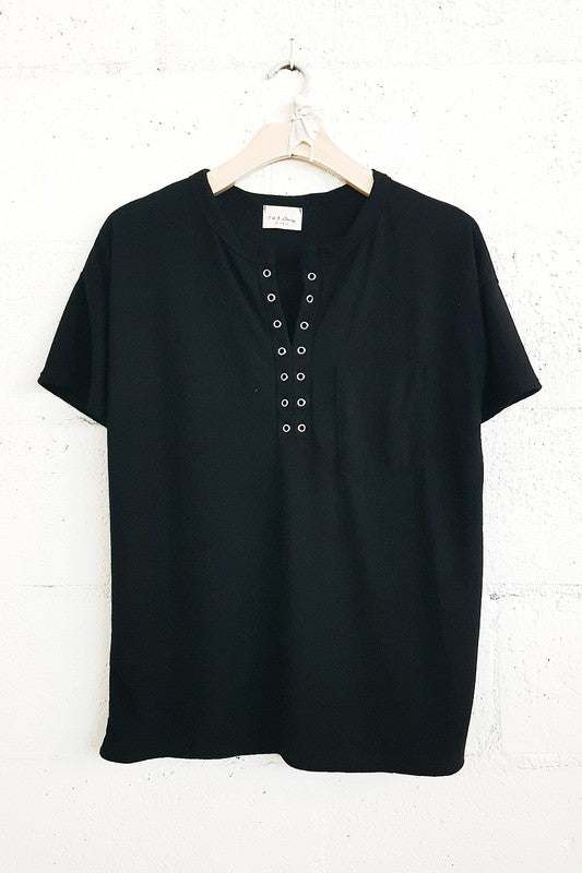 SOLID KNIT TEXTURED EYELET TOP WITH FRONT POCKET