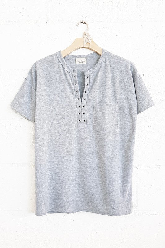 SOLID KNIT TEXTURED EYELET TOP WITH FRONT POCKET