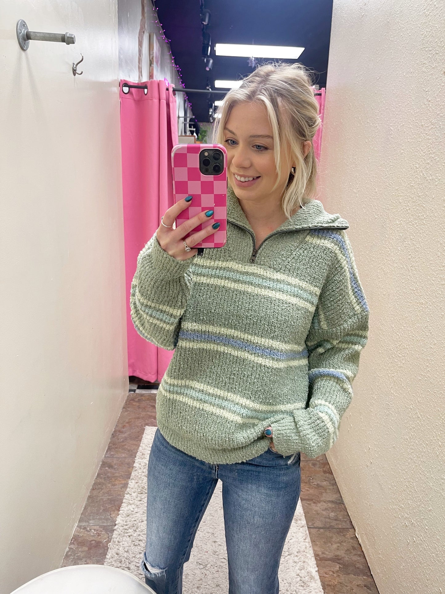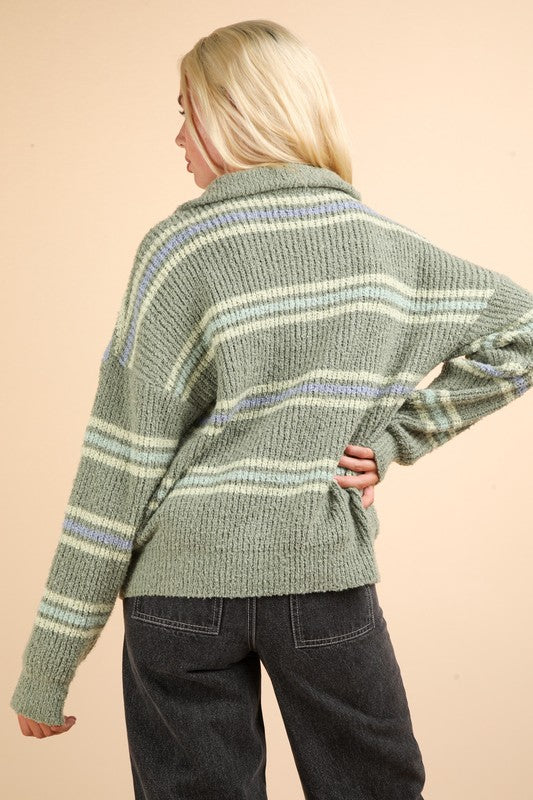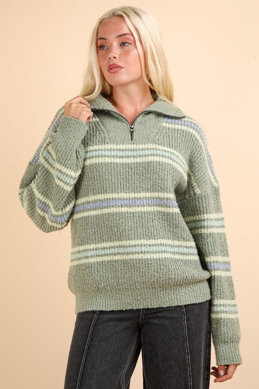 - Multi Color Striped Half Zip Up Knit Sweater Top - Oversized - Drop Shoulder - Long Sleeve - Soft Knit Henley Top