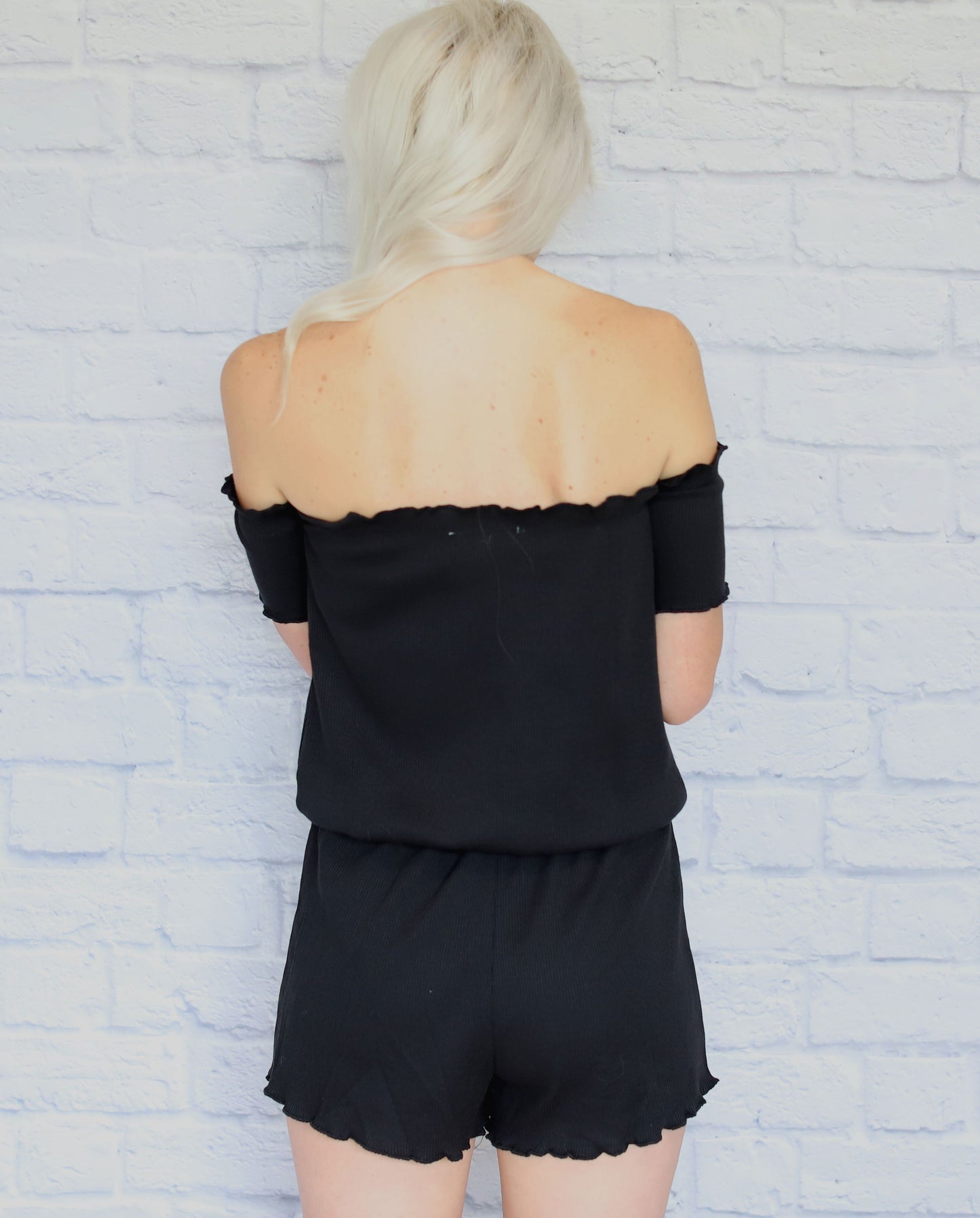 This is an off the shoulder rib knit romper with an elastic waistline and merrow hemline. Its cute enough to wear on date night and comfy enough to wear on a road trip!