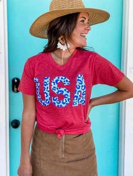 V neck with USA blue cheetah graphic tee