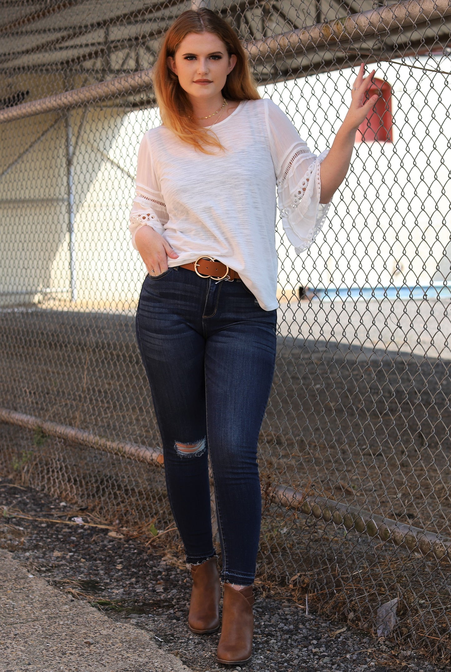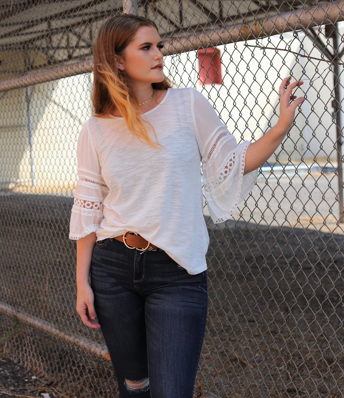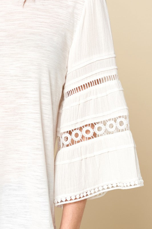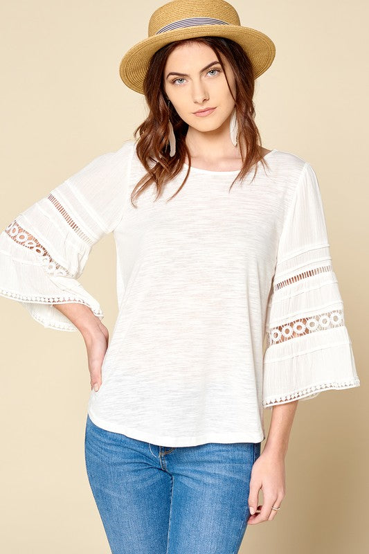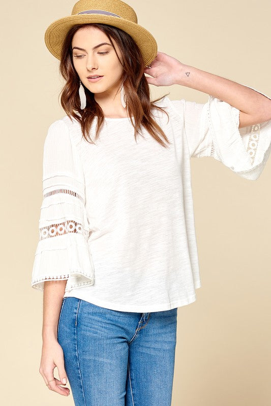 A perfect off white transition top! Features 3/4 length bell sleeves, and crochet and lace trimming.