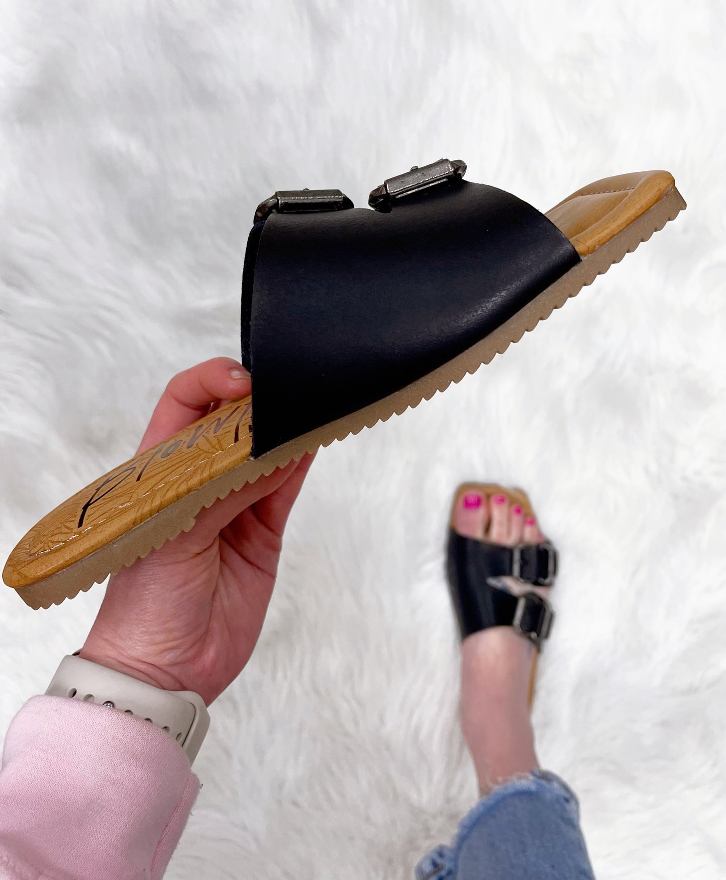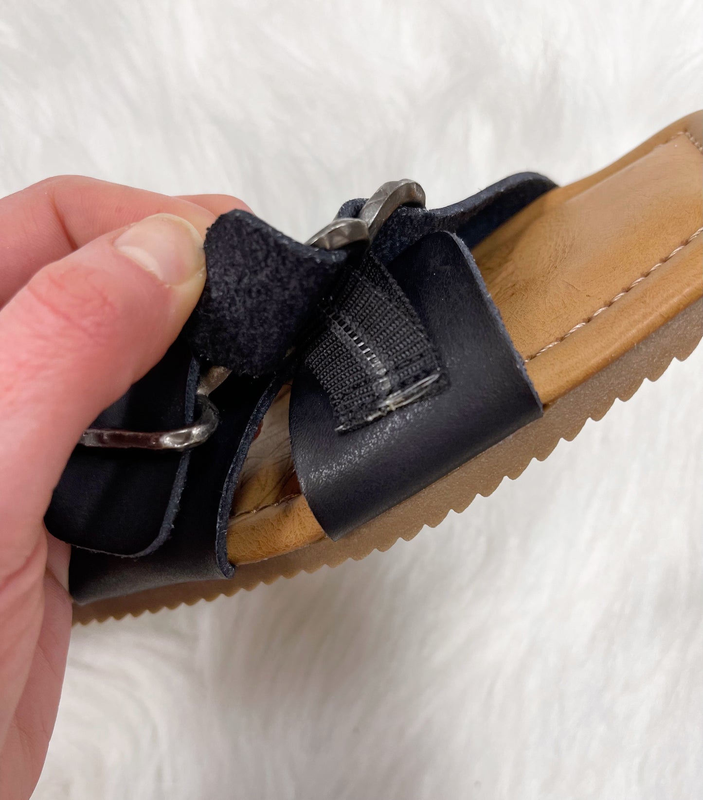 Black two strap sandal with functional buckles, comfy insole. Straps have elastic on back for a secure fit.